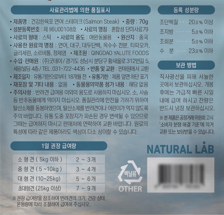 | 품명 및 모델명 | 건강한육포 연어 스테이크 | 인증사항 | 사료관리법에 따른 성분등록번호 : 컨텐츠 참조 |