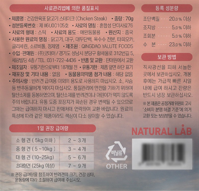 | 품명 및 모델명 | 건강한육포 닭고기 스테이크 | 인증사항 | 사료관리법에 따른 성분등록번호 : 컨텐츠 참조 |
