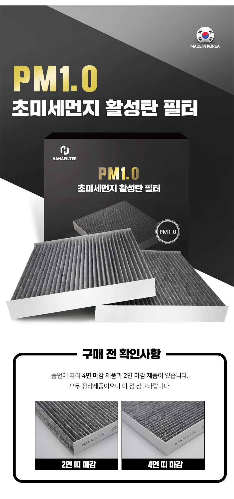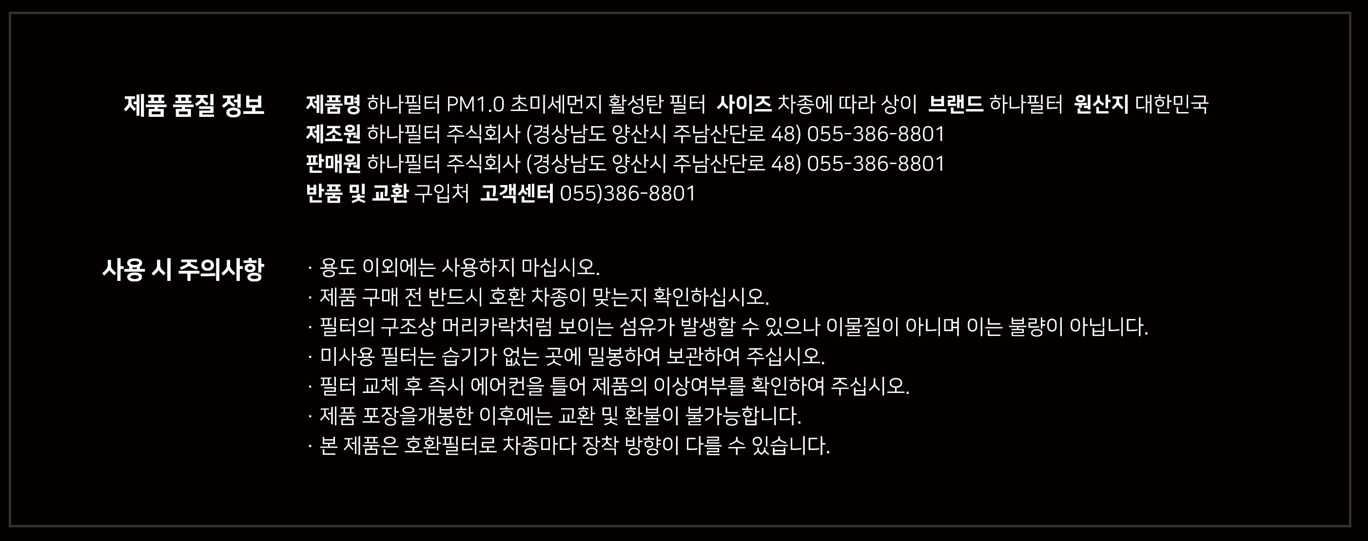 | 품명 및 모델명 | 하나필터 PM1.0 초미세먼지 활성탄 자동차 에어컨 필터 | 동일모델 출시년월 | 2024년1월 |