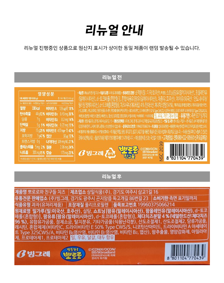 | 포장단위별 내용물의 용량(중량), 수량 | 65g x 12개 | 원재료명 및 함량 | 컨텐츠 참조 |