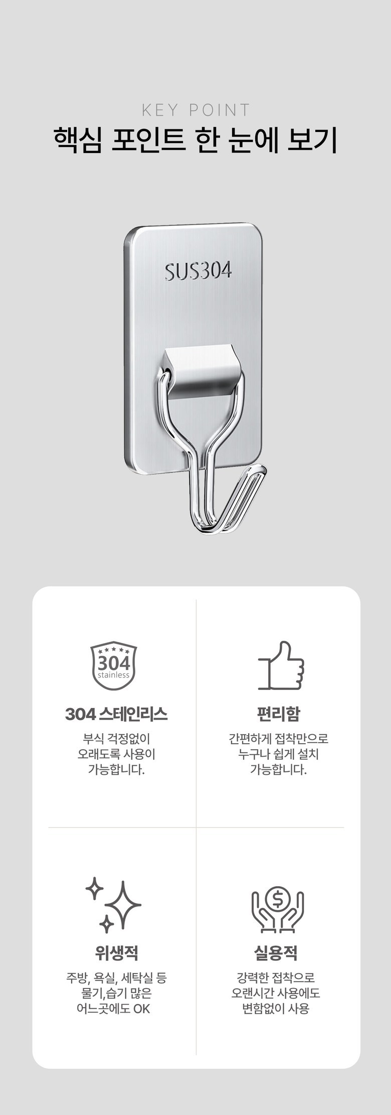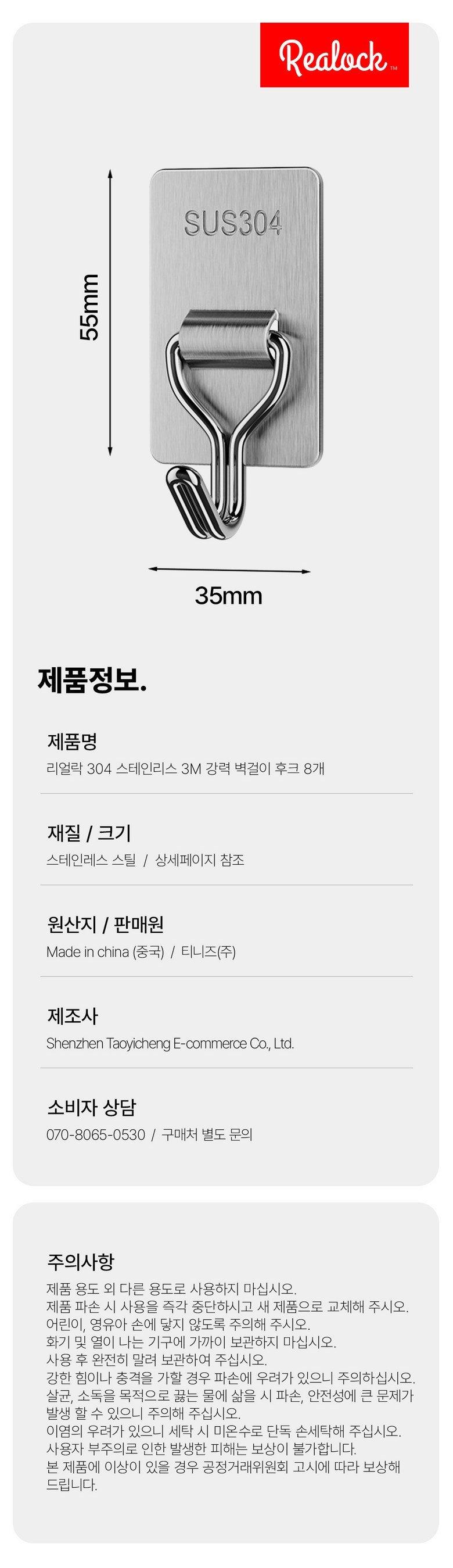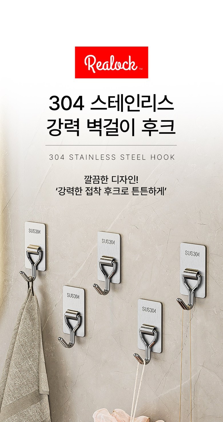 | 품명 및 모델명 | 리얼락 304 스테인리스 강력 벽걸이 후크 | 인증/허가 사항 | 해당없음 |