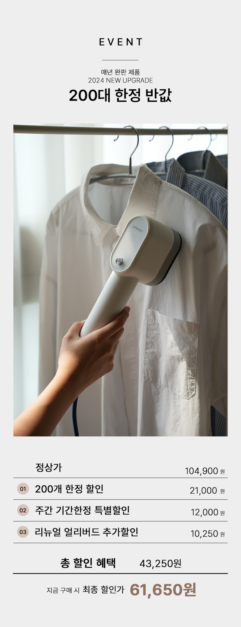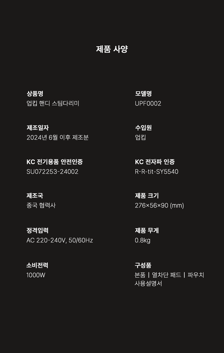 | 품명 및 모델명 | 업킵 미니핸디다리미 / UPF0002 | KC 인증정보 | SU072253-24002R-R-tit-SY5540 |