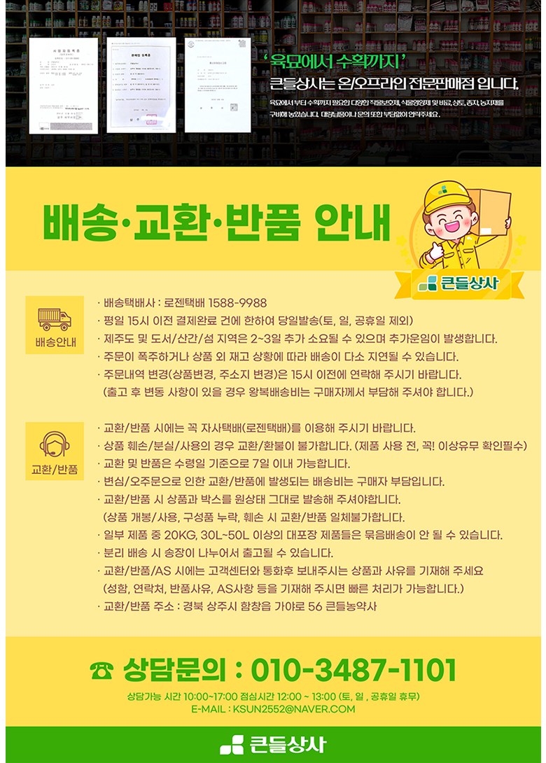 상호/대표자 | 큰들농약사 / 김선기 | 사업장 소재지 | 경상북도 상주시 함창읍 가야로 56 1층 |