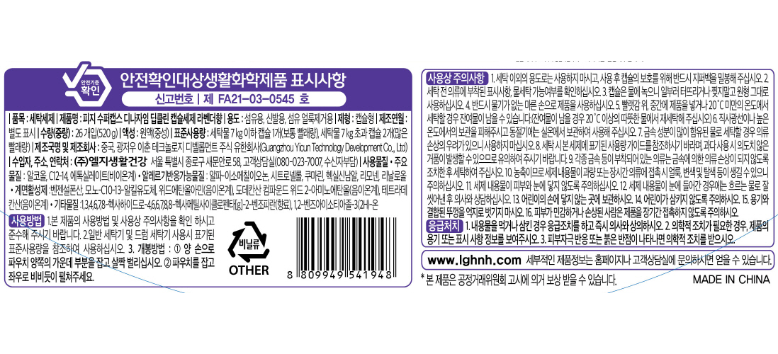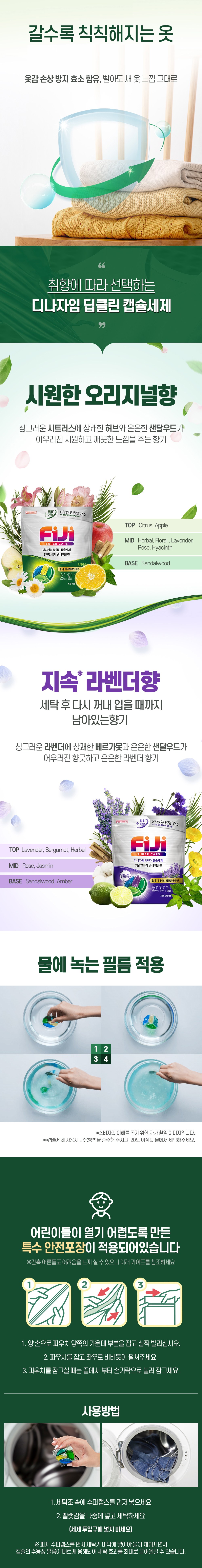 | 품목 및 제품명 | 세탁세제 / 피지 수퍼캡스 디나자임 딥클린 캡슐세제 라벤더향 | 용도(표백제의 경우 계열을 함께표시) 및 제형 | 섬유용,신발용,섬유 얼룩제거용 / 캡슐형 |