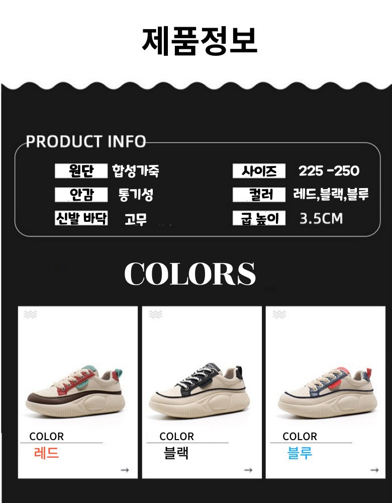 | 제품의 주소재(운동화인 경우에는 겉감,안감을 구분하여 표시) | 겉감:인조가죽 / 안감: 망사원단 | 색상 | 레드,블랙,블루 |