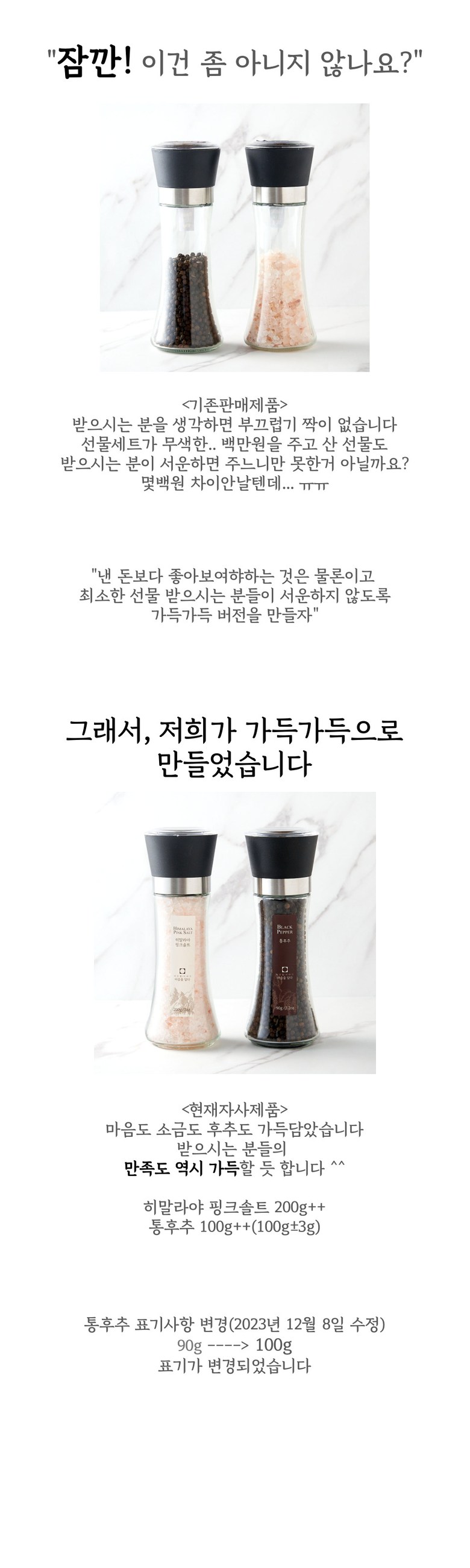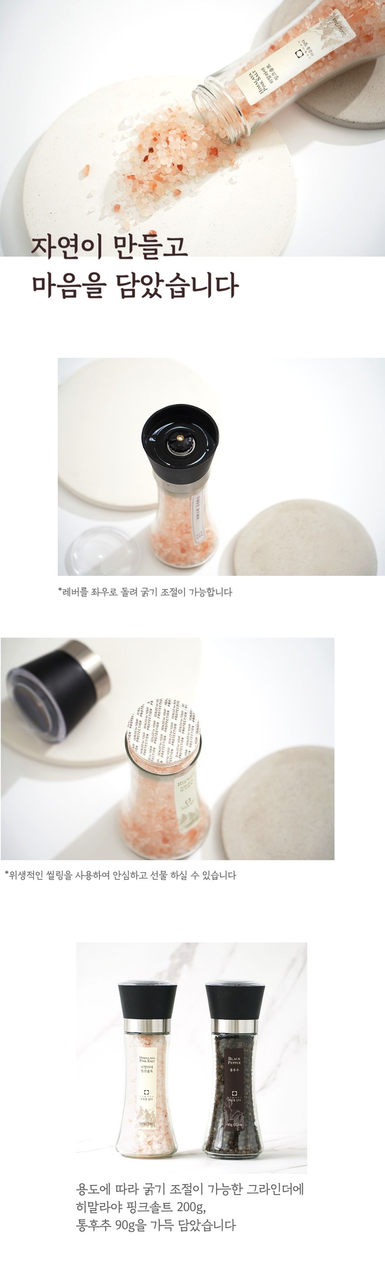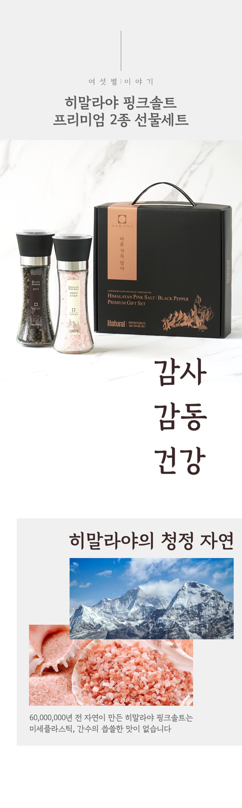 | 품목 또는 명칭 | 히말라야핑크솔트 통후추 선물세트 | 포장단위별 내용물의 용량(중량),수량,크기 | 히말라야핑크솔트 200g + 블랙페퍼 100g |
