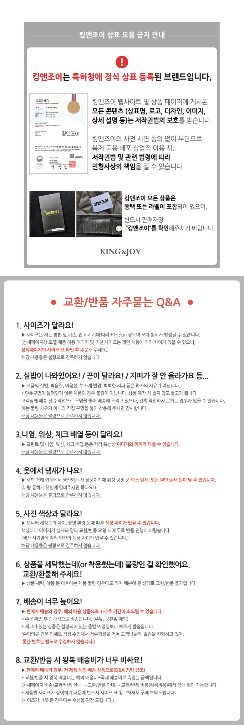 | 교환/반품 비용 (왕복비용) | 8,000원 - 단, 고객 변심의 경우에만 발생 - 도서산간 및 일부 지역 추가비용 발생 |