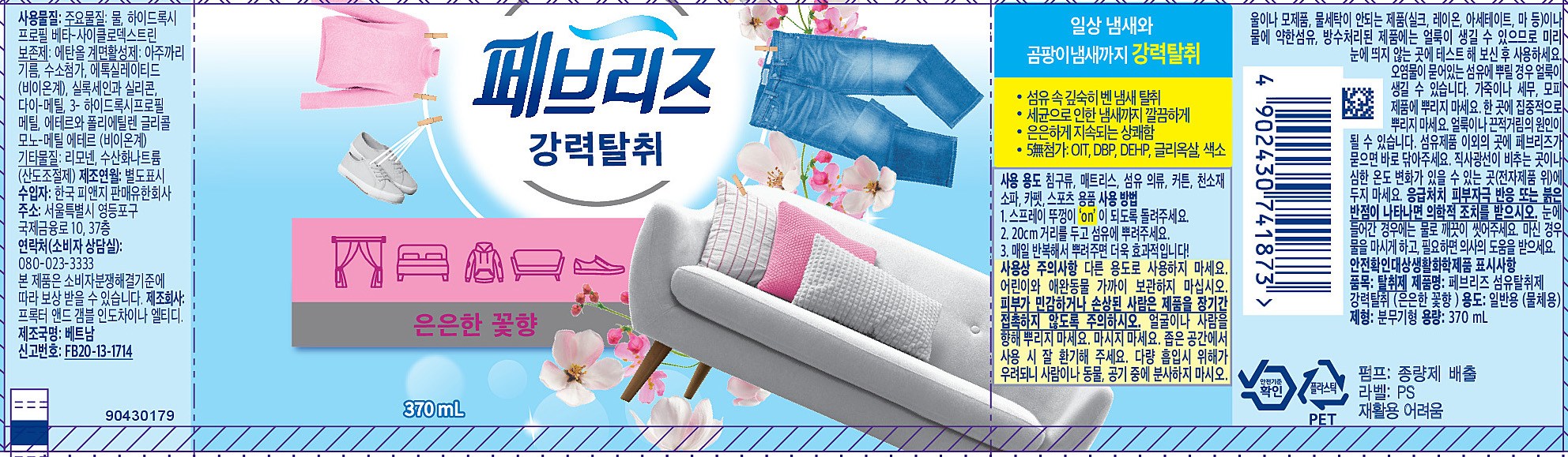 | 품목 및 제품명 | 탈취제 / 페브리즈 섬유탈취제 강력탈취 (은은한 꽃향) | 용도(표백제의 경우 계열을 함께표시) 및 제형 | 일반용(물체용) / 분무기형 |