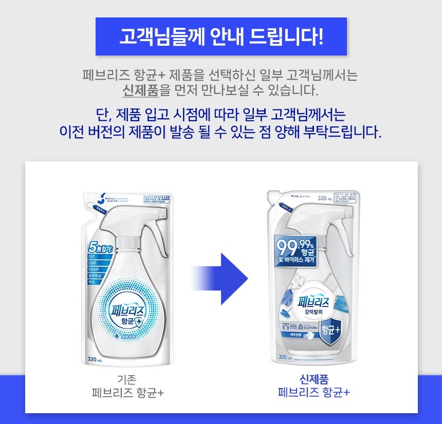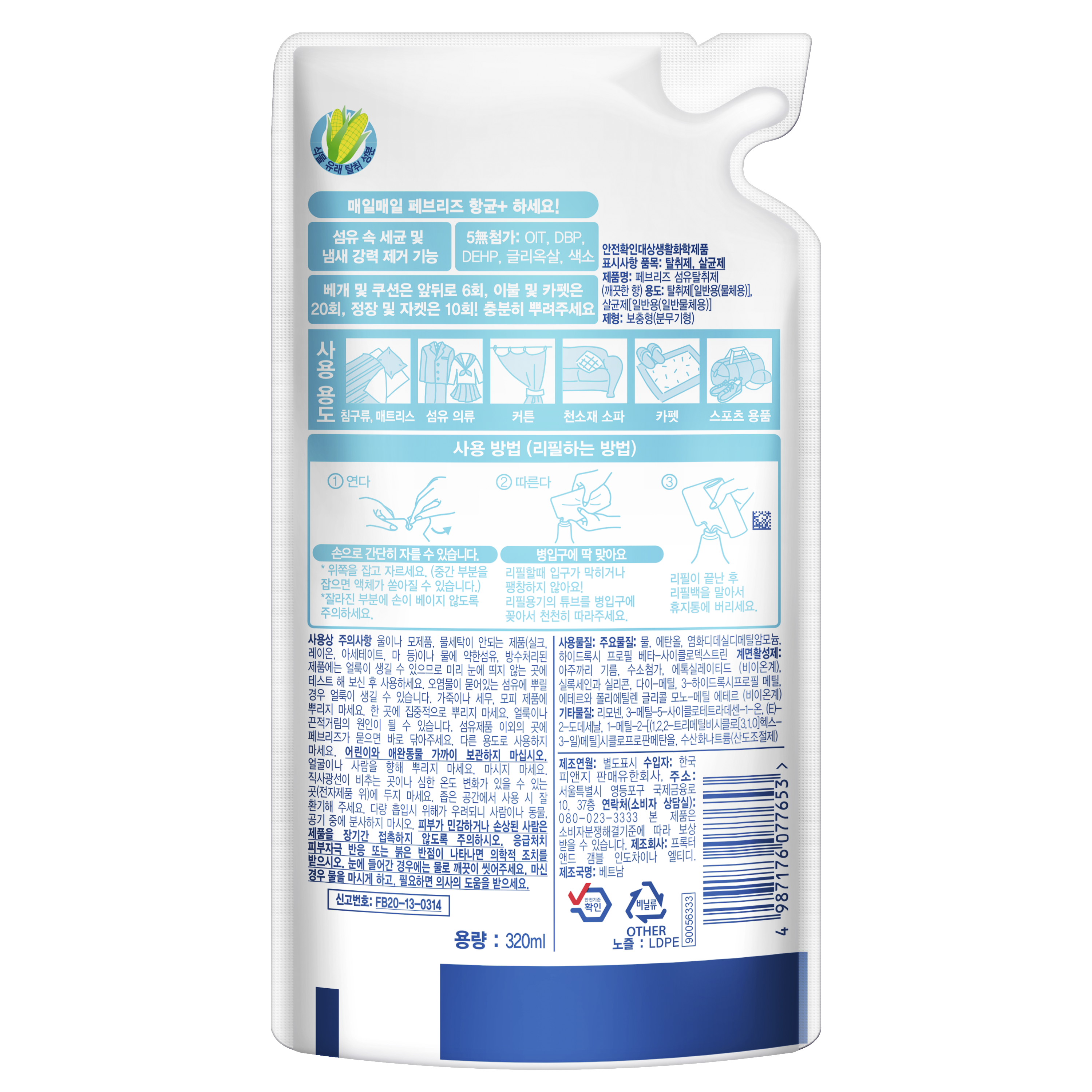 | 품목 및 제품명 | 탈취제, 살균제 / 페브리즈 섬유탈취제 (깨끗한 향) | 용도(표백제의 경우 계열을 함께표시) 및 제형 | 탈취제(일반용(물체용)), 살균제(일반용(일반물체용)) / 보충형 (분무기형) |