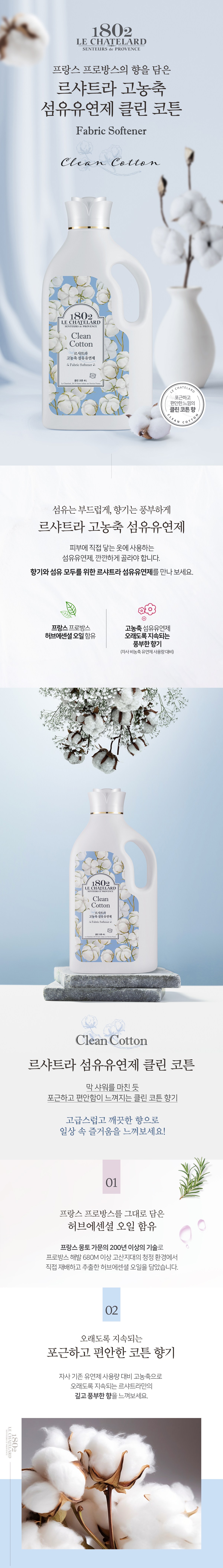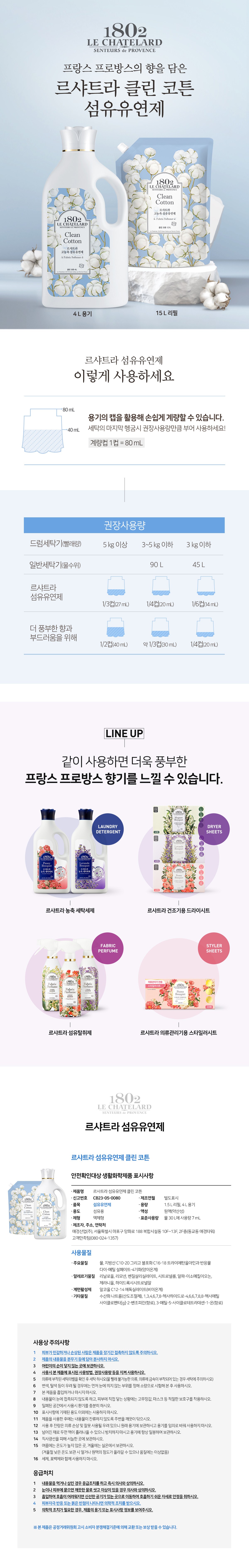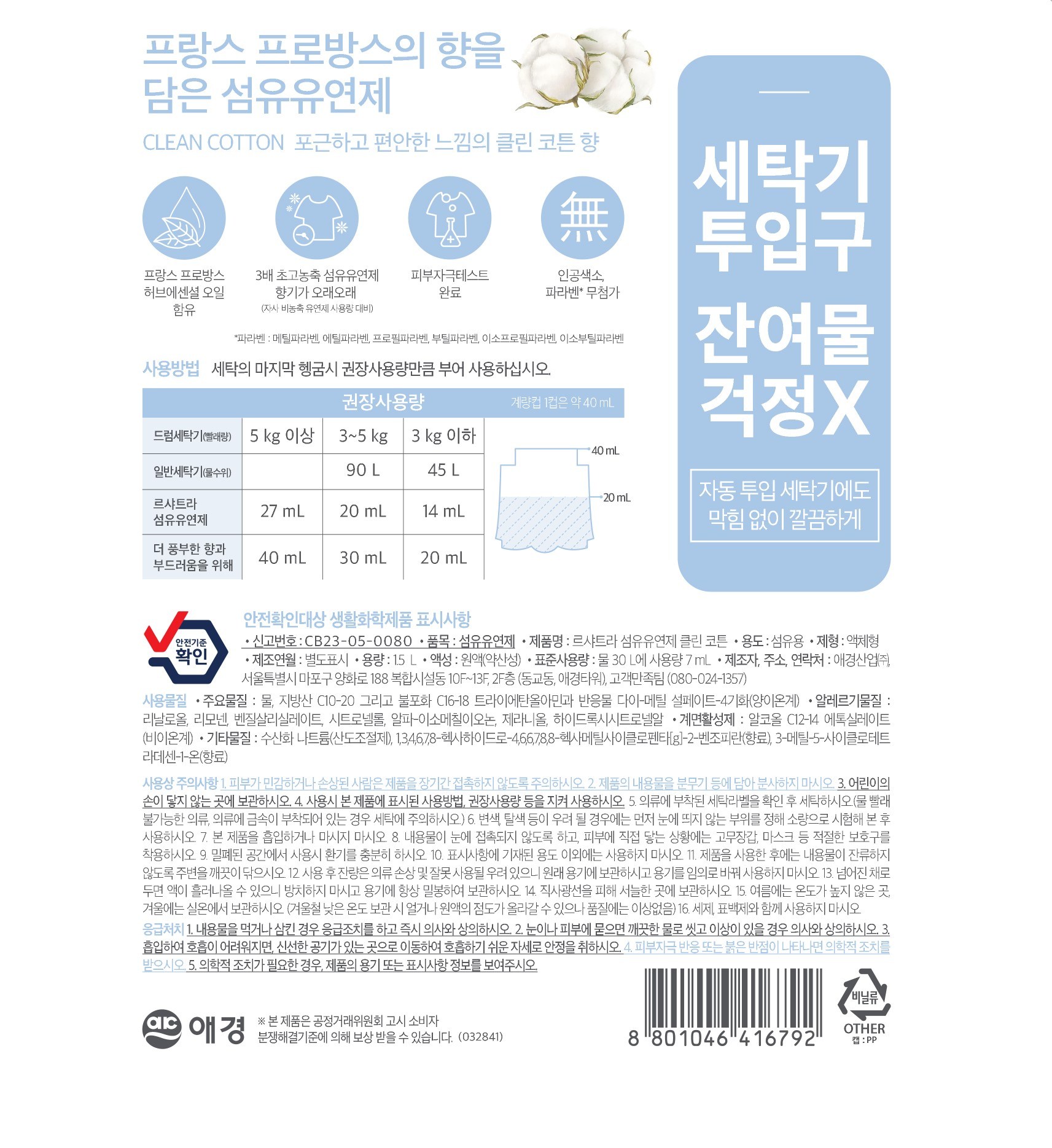 | 품목 및 제품명 | 섬유유연제 / 르샤트라 섬유유연제 클린 코튼 | 용도(표백제의 경우 계열을 함께표시) 및 제형 | 섬유용 / 액체형 |