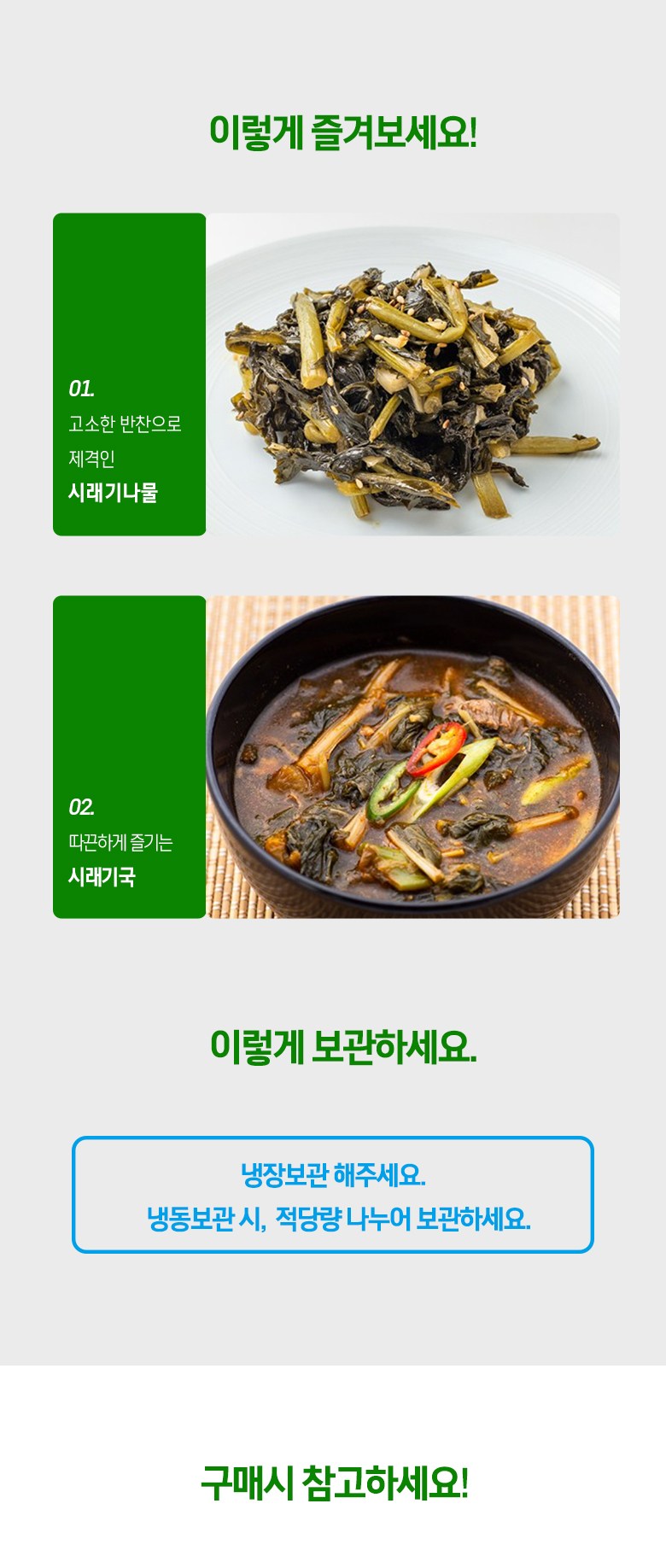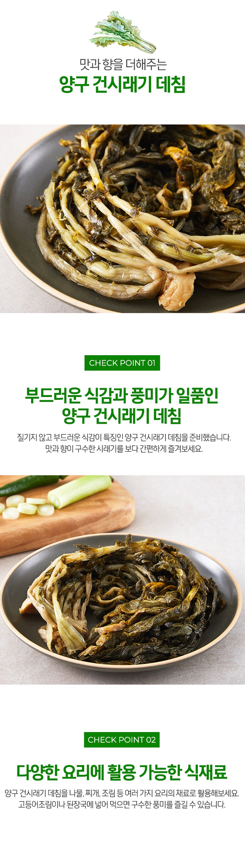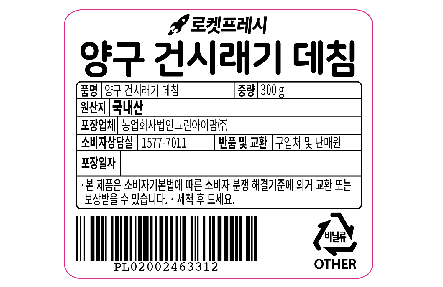 | 품목 또는 명칭 | 양구 건시래기 데침 | 포장단위별 내용물의 용량(중량),수량,크기 | 300g x 6봉 |