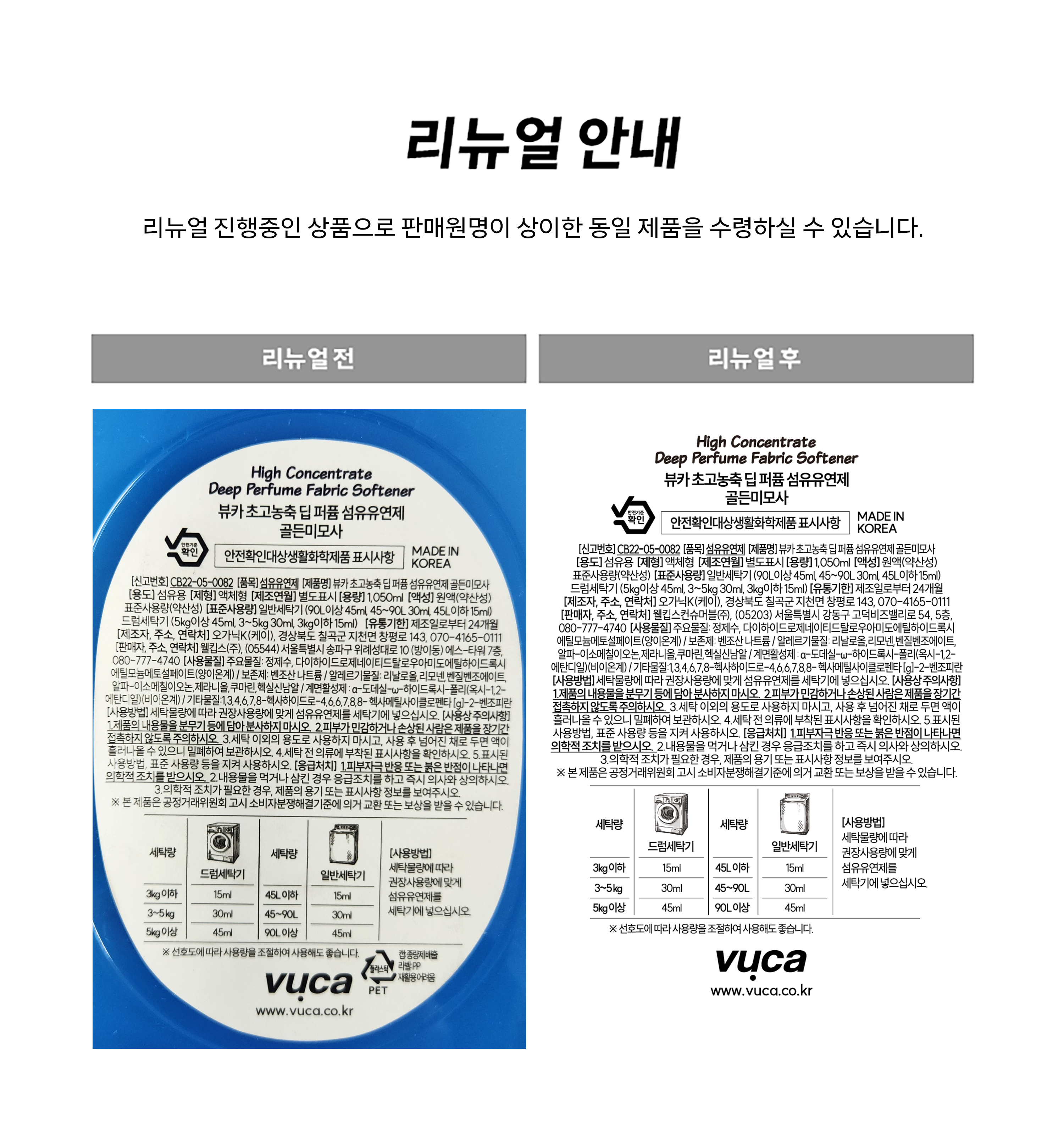 | 품목 및 제품명 | 섬유유연제 / 뷰카 초고농축 딥 퍼퓸 섬유유연제 골든미모사 | 용도(표백제의 경우 계열을 함께표시) 및 제형 | 섬유용 / 액체형 |