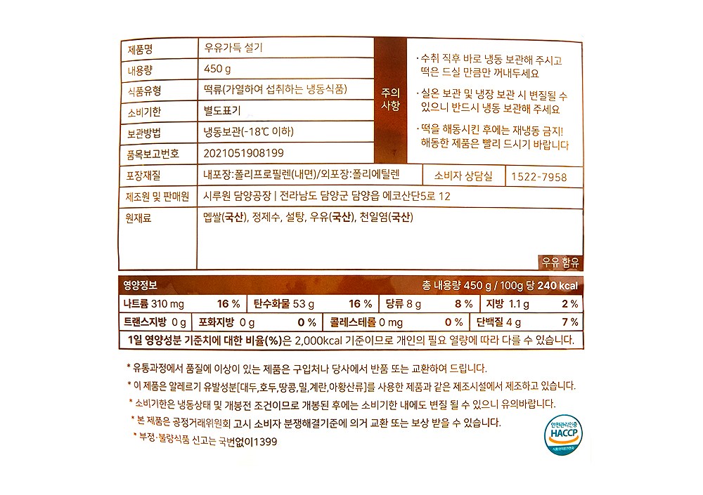 부드러운 맛이 매력적인 우유 설기예요. 백설기 본연의 담백한 맛에 우유의 고소함까지 더했죠. 전자레인지나 밥솥, 찜기로 해동만 하면, 갓 만든 떡처럼 촉촉한 식감을 만끽할 수 있답니다. 낱개로 개별 포장되어 있으니, 그때그때 원하는 만큼 꺼내 드실 수 있어요.