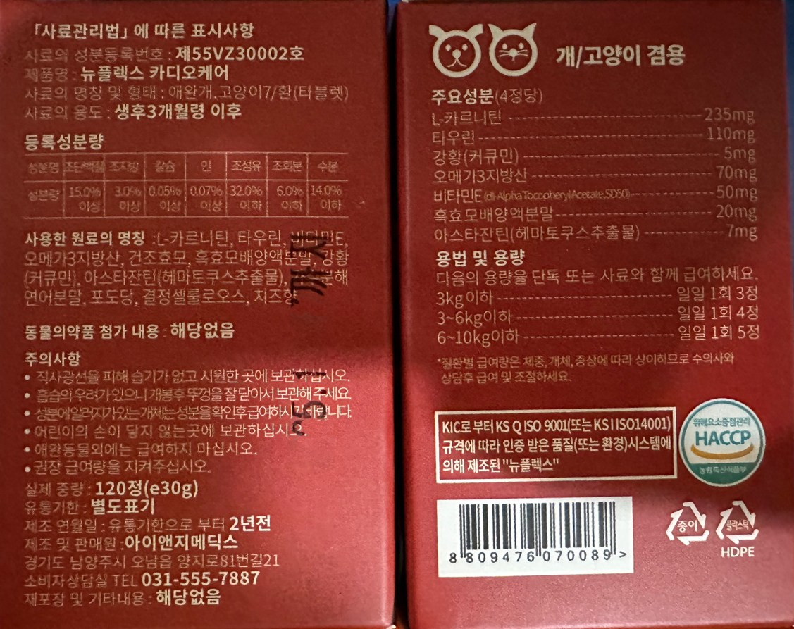 | 품명 및 모델명 | 뉴플렉스 카디오케어 | 인증/허가 사항 | 사료관리법에 따른 성분등록번호 : 컨텐츠 참조 |