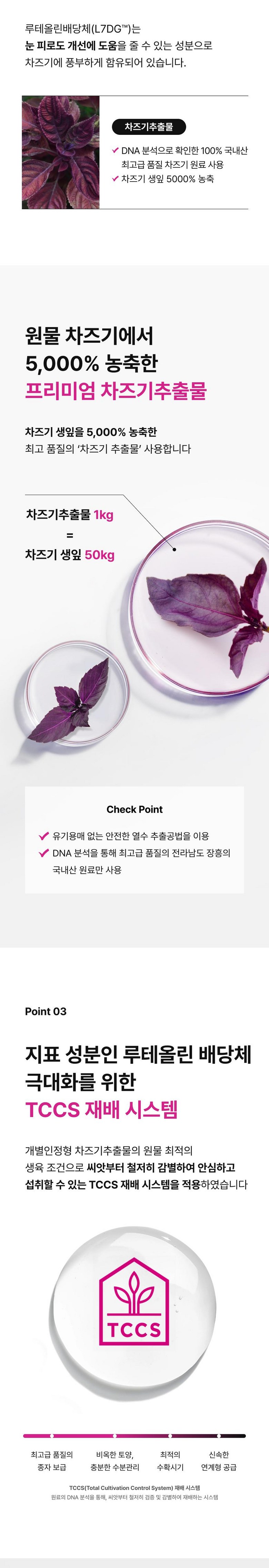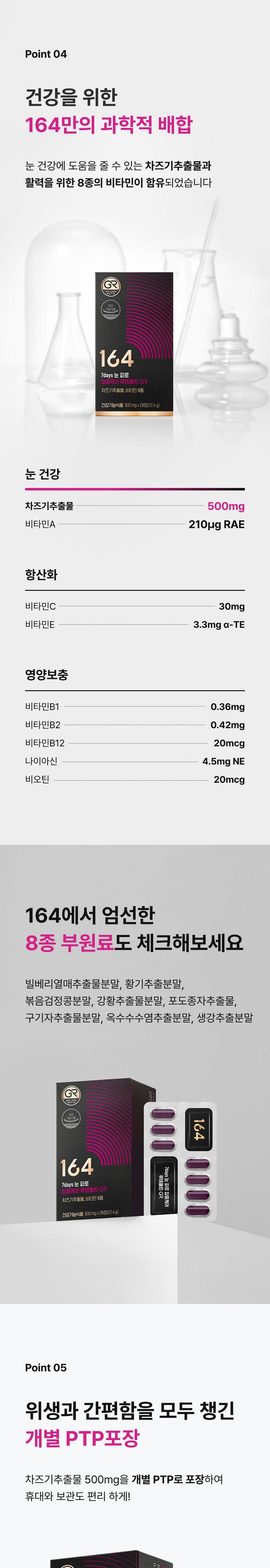 | 원료명 및 함량 | 차즈기추출물(국산), 비타민C, 비타민E혼합제제(dl-α-토코페릴아세테이트, 옥테닐호박산나트륨전분, 포도당시럽분말, 이산화규소), 니코틴산아미드, 비오틴혼합제제(비오틴, 제이인산칼슘), 비타민B12혼합제제(비타민B12, 제이인산칼슘), 비타민A혼합제제{유성비타민A지방산에스테르, 포도당시럽분말, 아라비아검, 옥수수전분, 비타민E(dl-α-토코페롤)}, 비타민B1질산염, 비타민B2, 결정셀룰로스, 히드록시프로필메틸셀룰로스, 이산화규소, 스테아린산마그네슘, 글리세린지방산에스테르, 이산화티타늄(착색료), 락색소, 강황추출물분말(인도산), 황기추출분말(국산), 볶음검정콩분말, 구기자추출물분말, 생강추출분말, 미르틸루스산앵도열매추출물분말(빌베리열매추출물분말), 옥수수수염추출분말, 포도종자추출물, 치자청색소 *대두함유 | 영양정보 | 1일 섭취량: 1정 (800mg)1일 섭취량 당 함량: 열량 0 kcal, 탄수화물 1 g 미만(0%), 단백질 0 g(0%), 지방 0 g(0%), 나트륨 0 mg(0%), Luteolin-7-O-diglucuronide 22.3 mg, 비타민A 210 ug RAE(30%), 비타민B1 0.36 mg(30%), 비타민B2 0.42 mg(30%), 비타민B12 20 ug(833%), 비타민C 30 mg(30%), 비타민E 3.3mg α-TE(30%), 나이아신 4.5 mg NE(30%), 비오틴 20 ug(67%)※ ( )안의 수치는 1일 영양성분기준치에 대한 비율임 |