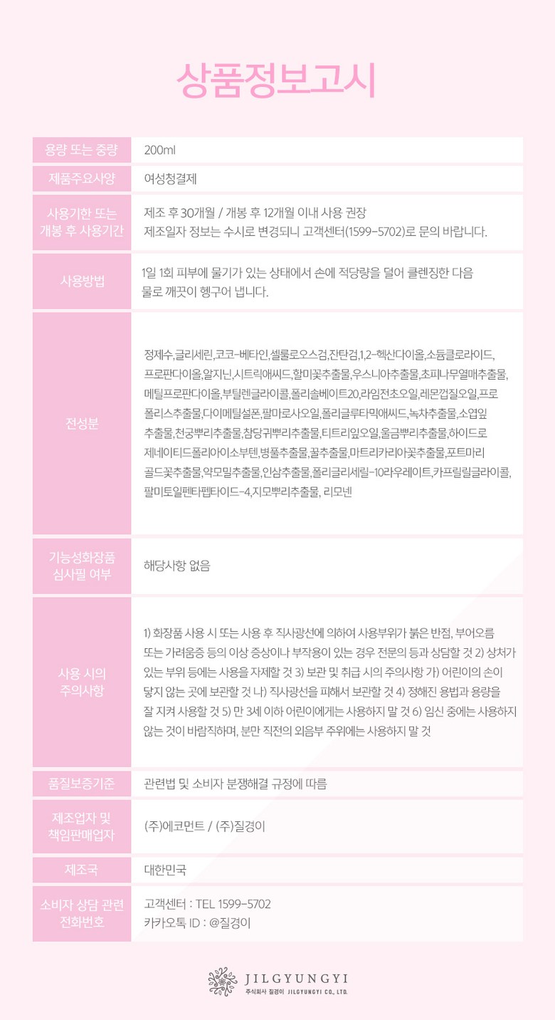 | 용량(중량) | 200ml | 제품 주요 사양 | 여성청결제 |