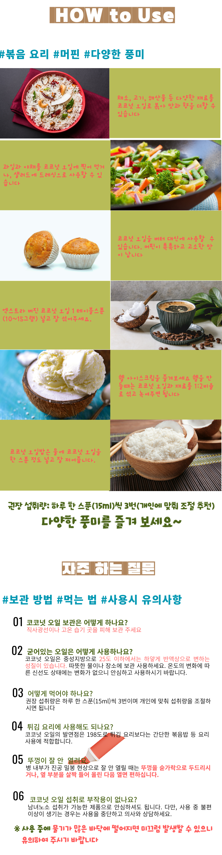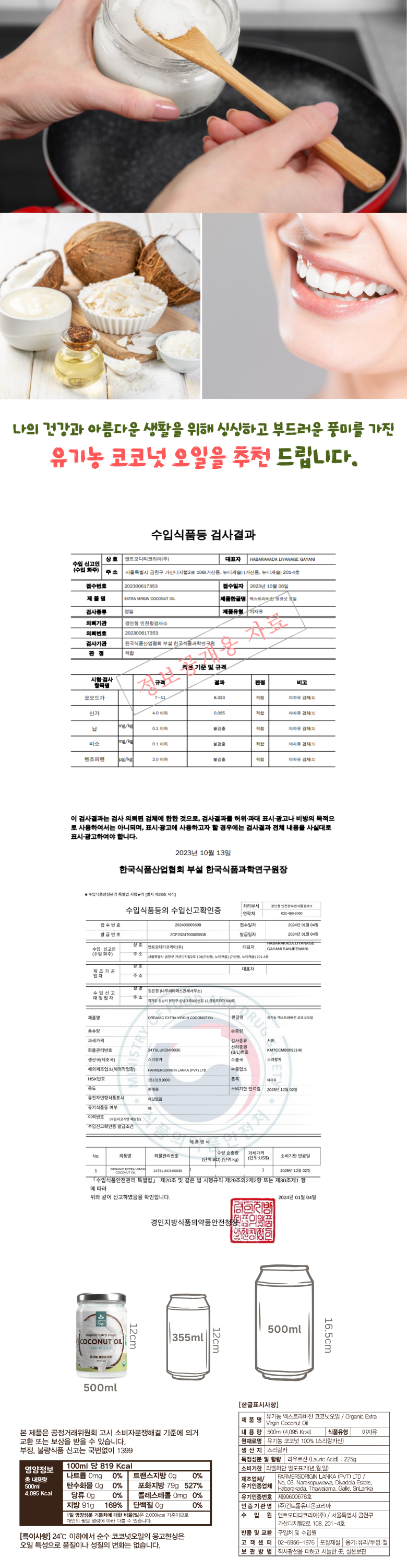 | 포장단위별 내용물의 용량(중량), 수량 | 500ml, 20L | 원재료명 및 함량 | 100% 유기농 코코넛오일 |