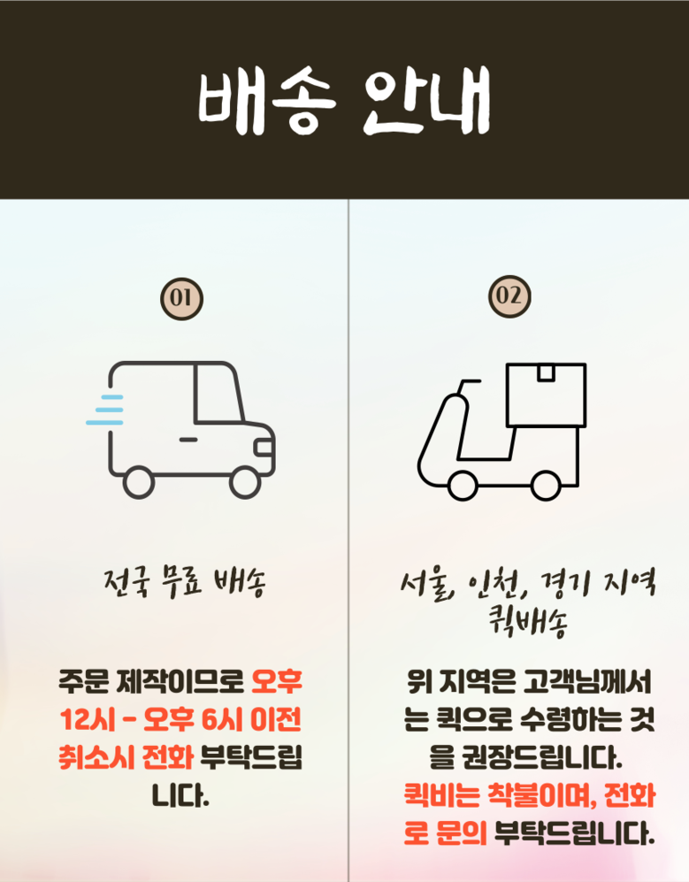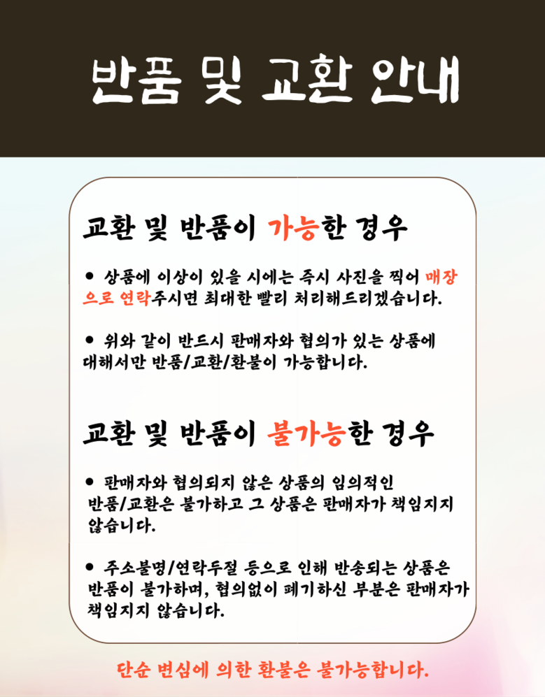 - ㆍ모니터 해상도의 차이로 인해 색상이나 이미지가 실제와 달라, 고객이 단순 변심으로 교환/반품을 무료로 요청하는 경우