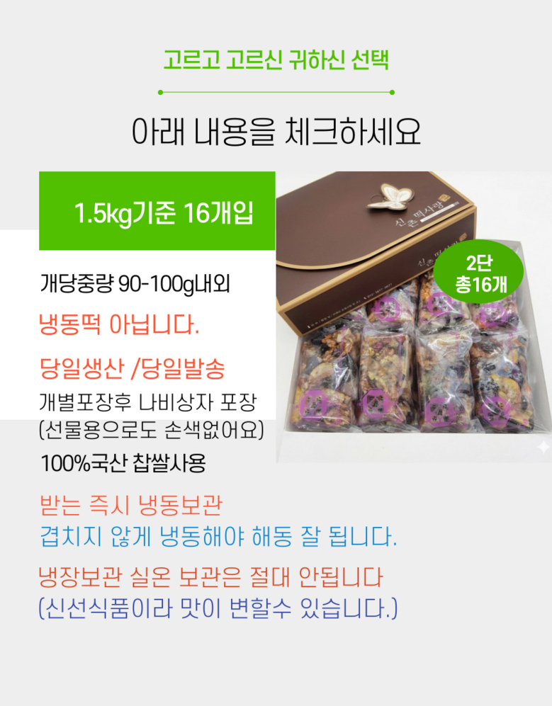신촌 떡사랑 국내산쌀 당일생산 제조 모듬 영양 찰떡 모듬찰떡 쇠머리찰떡 식사대용 국산찹쌀100% 건강식 식사대용 개별포장 (1;5kg) 어버이날 선물