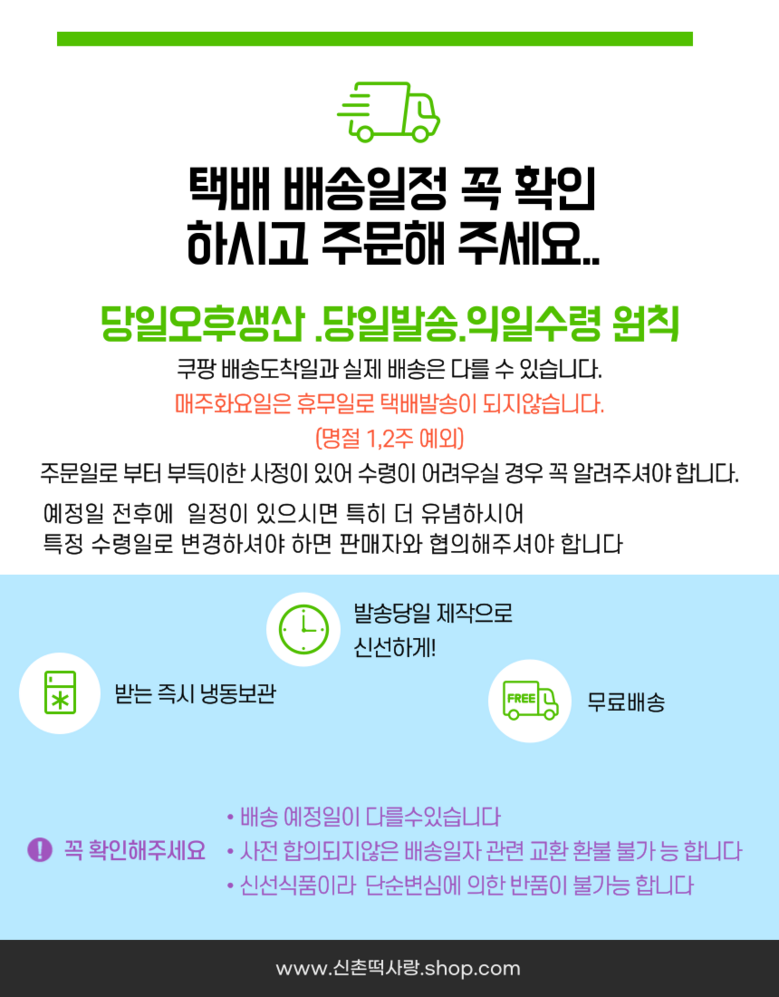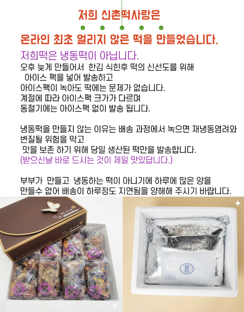 | 생산자 및 소재지 | 신촌떡사랑/서울 양천구 목동중앙남로43 | 제조연월일, 소비기한 또는 품질유지기한 | 주문제조,주문후 3개월 냉동보관,방부제가 들어가 있지않으니 가급적 빨리 드시길 권장 합니다 |