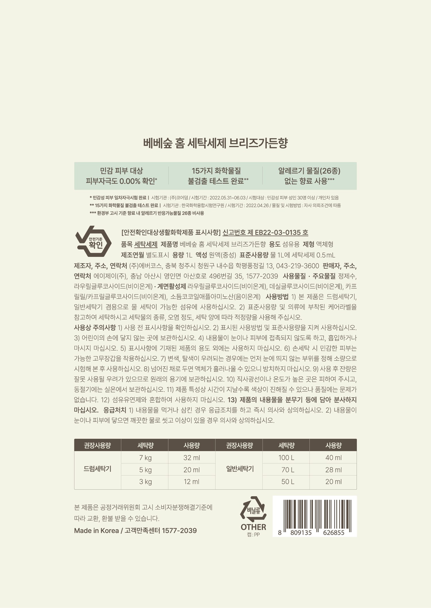 | 품목 및 제품명 | 세탁세제 / 베베숲 홈 세탁세제 브리즈가든향 | 용도(표백제의 경우 계열을 함께표시) 및 제형 | 섬유용 / 액체형 |