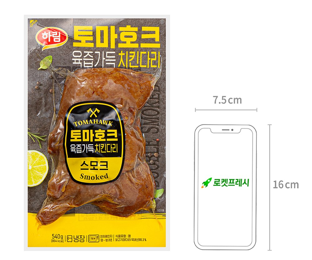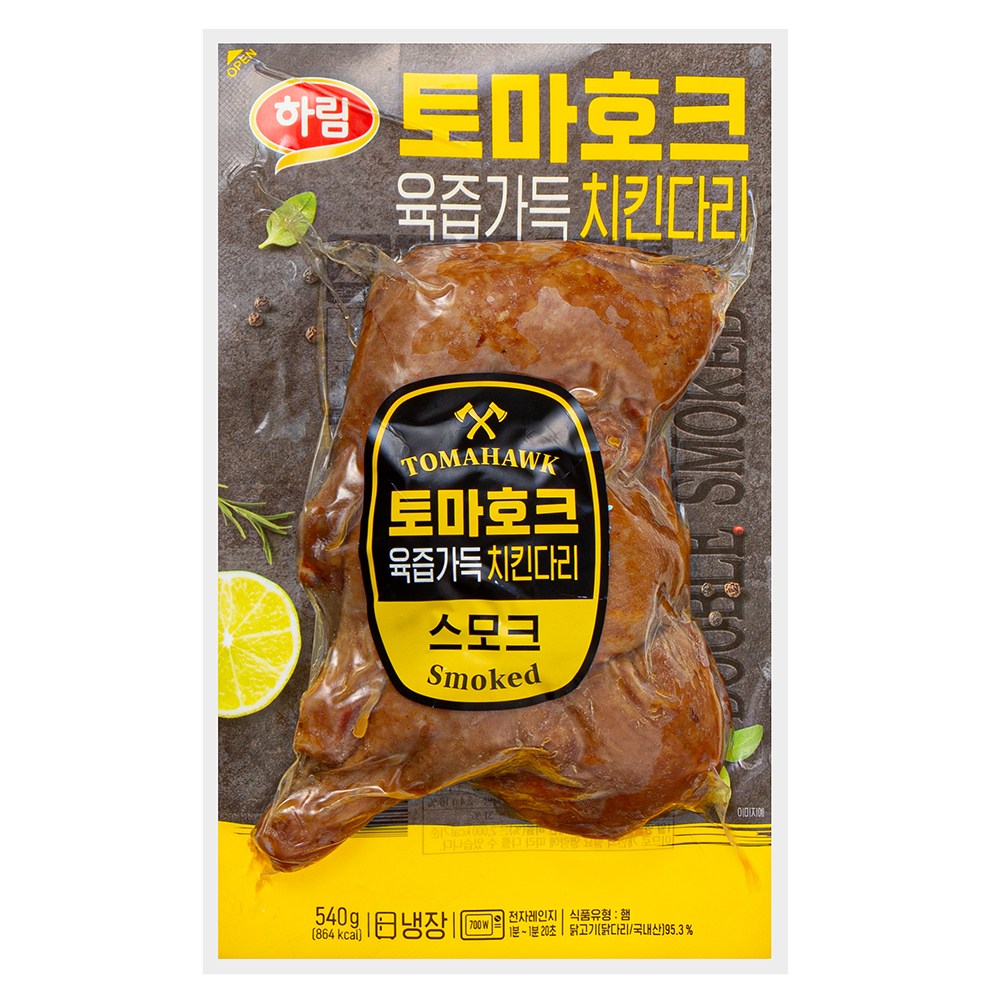 큼지막한 크기의 토마호크 치킨다리 스모크예요. 야들야들한 식감이 좋아 자꾸만 손이 가지요. 한 입 베어 물면, 닭다리의 고소한 육즙이 입맛을 사로잡는답니다. 출출할 때 먹을 간식으로, 술 한 잔을 곁들일 안주로 다채롭게 활용해보세요.