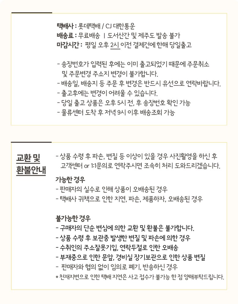 - ㆍ모니터 해상도의 차이로 인해 색상이나 이미지가 실제와 달라, 고객이 단순 변심으로 교환/반품을 무료로 요청하는 경우