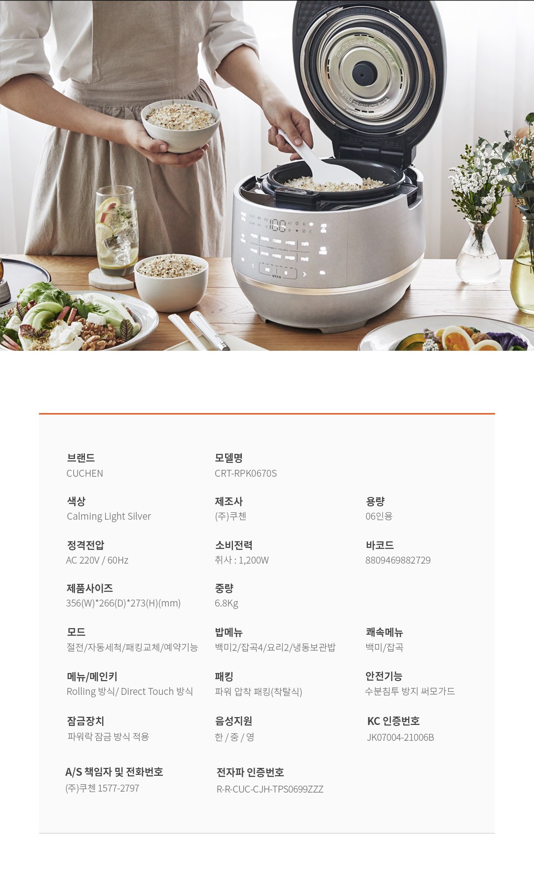 | 품명 및 모델명 | 쿠첸 2.1기압 121 IH 전기 압력밥솥 6인용 / CRT-RPK0670S | KC 인증정보 | JK07004-21006B , R-R-CUC-CJH-TPS0699ZZZ |