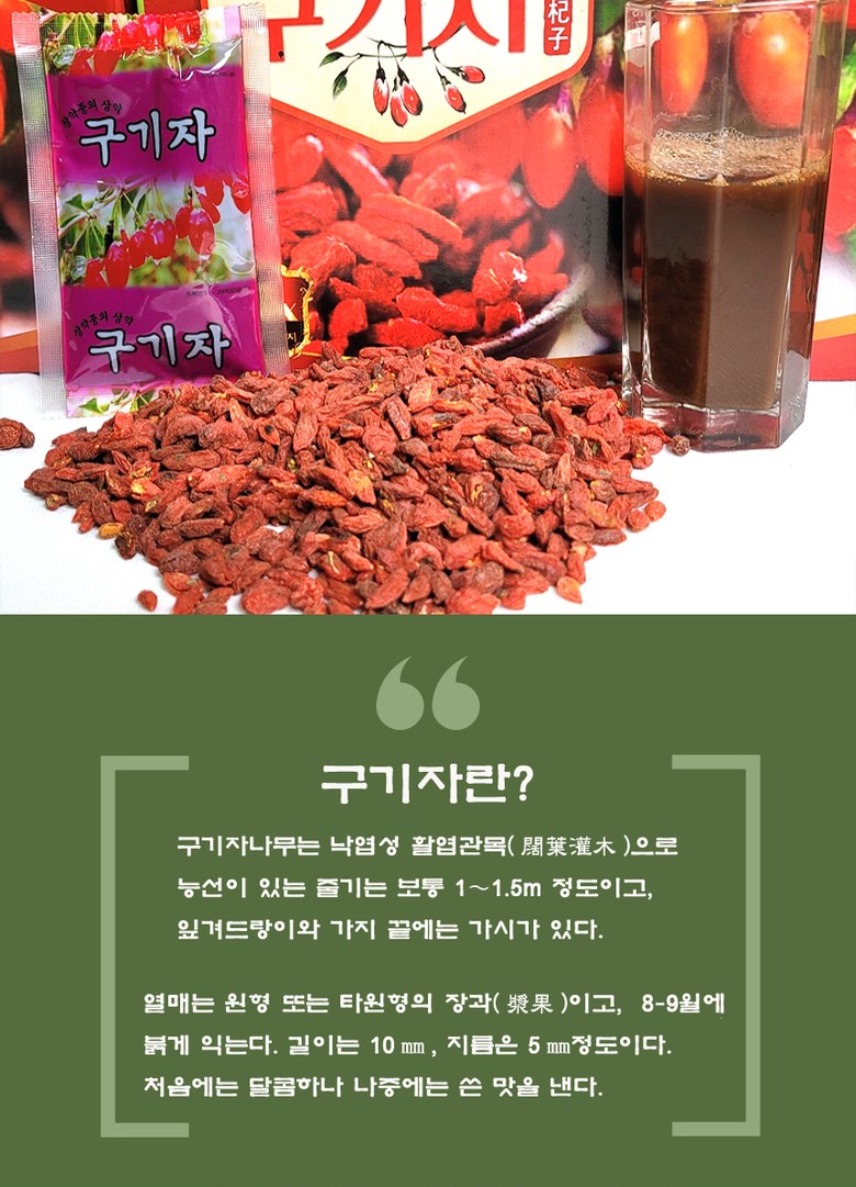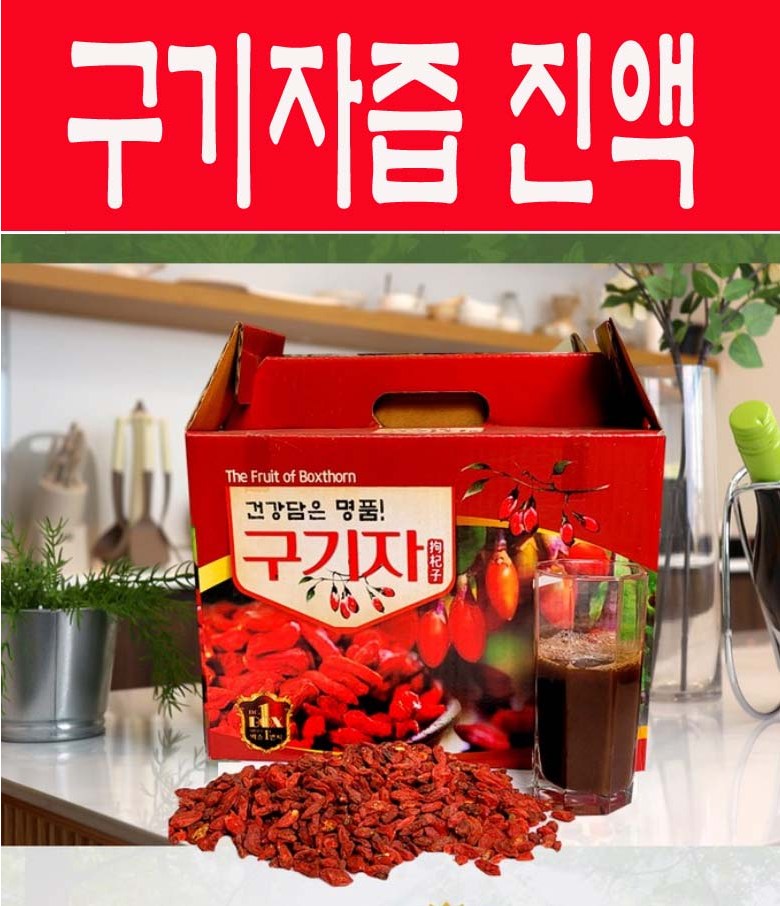 | 포장단위별 내용물의 용량(중량), 수량 | 100mlx60포 | 원재료명 및 함량 | 구기자열매( 중국산)90%,지구자 (중국산)8%,대추(국내산)2% |