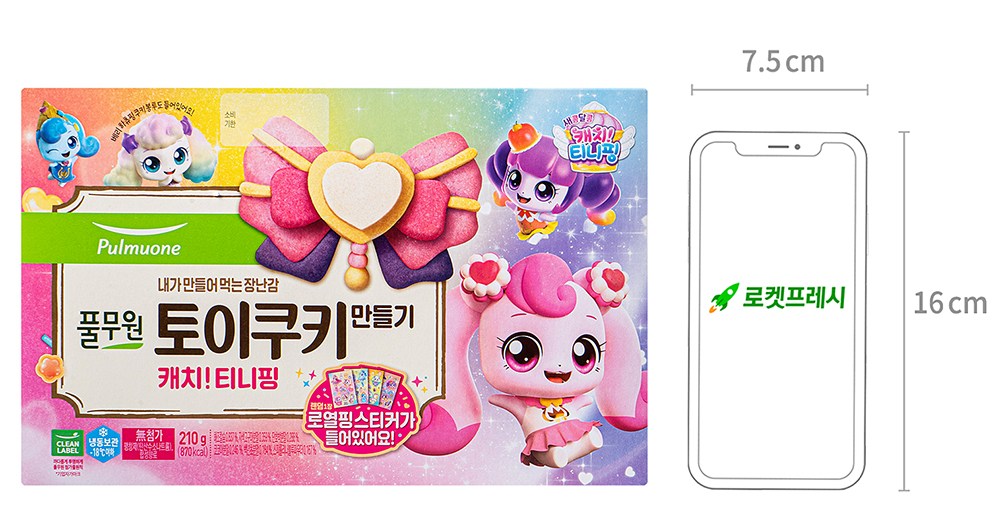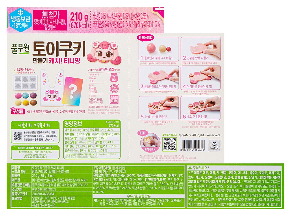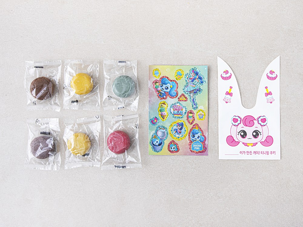 6가지 색의 토이 쿠키 반죽, 랜덤 스티커, 쿠키 봉투, 쿠키 틀로 구성되어 있습니다.