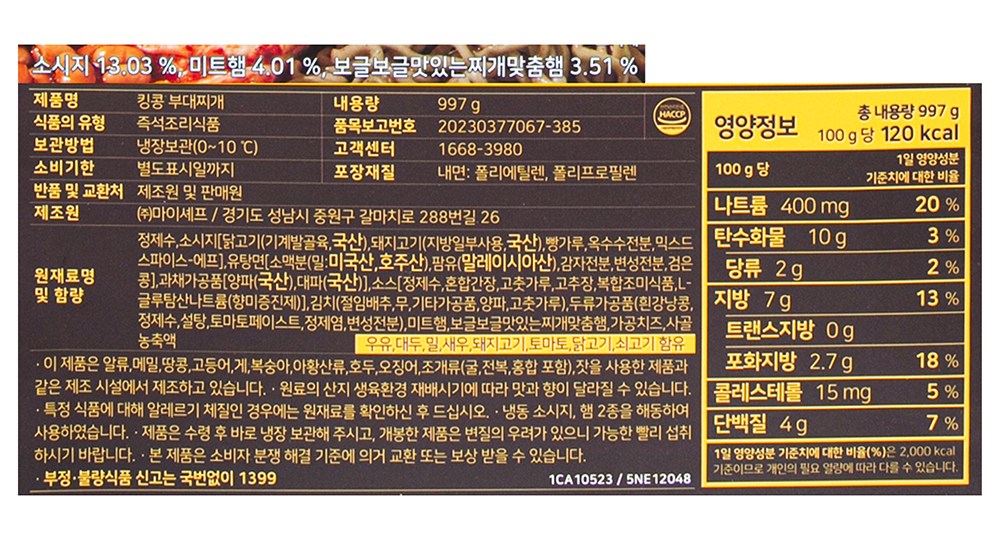 | 포장단위별 내용물의 용량(중량), 수량 | 997g x 3개 | 원재료명 및 함량 | 컨텐츠 참조 |