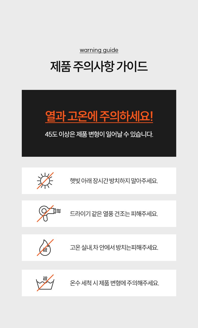 | 교환/반품 신청 기준일 | ㆍ단순변심에 의한 교환/반품은 제품 수령 후 7일 이내까지, 교환/반품 제한사항에 해당하지 않는 경우에만 가능 (배송비용과 교환/반품 비용 왕복배송비 고객부담) ㆍ상품의 내용이 표시·광고의 내용과 다른 경우에는 상품을 수령한 날부터 3개월 이내, 그 사실을 안 날 또는 알 수 있었던 날부터 |