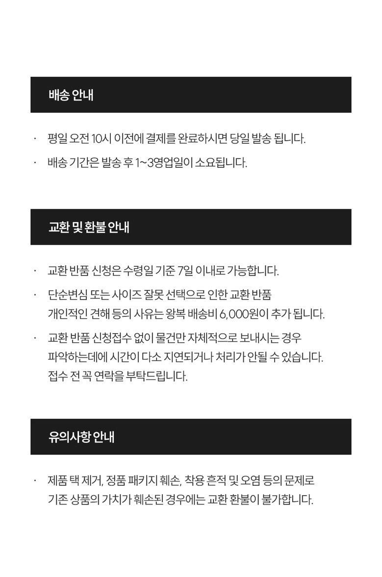 | 교환/반품 비용 (왕복비용) | 6,000원 - 단, 고객 변심의 경우에만 발생 - 도서산간 지역 배송불가 |