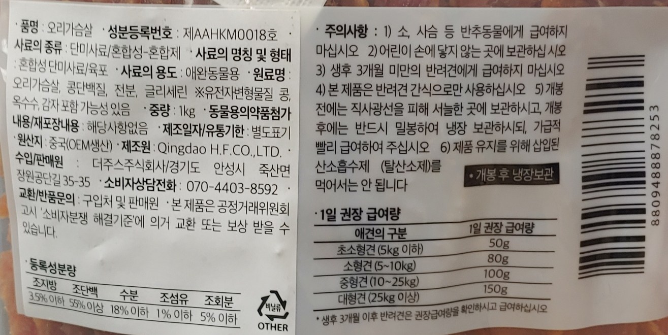 | 품명 및 모델명 | 슈퍼츄 일킬로그램 가득 담은 오리가슴살 1kg | 인증사항 | 해당없음 |