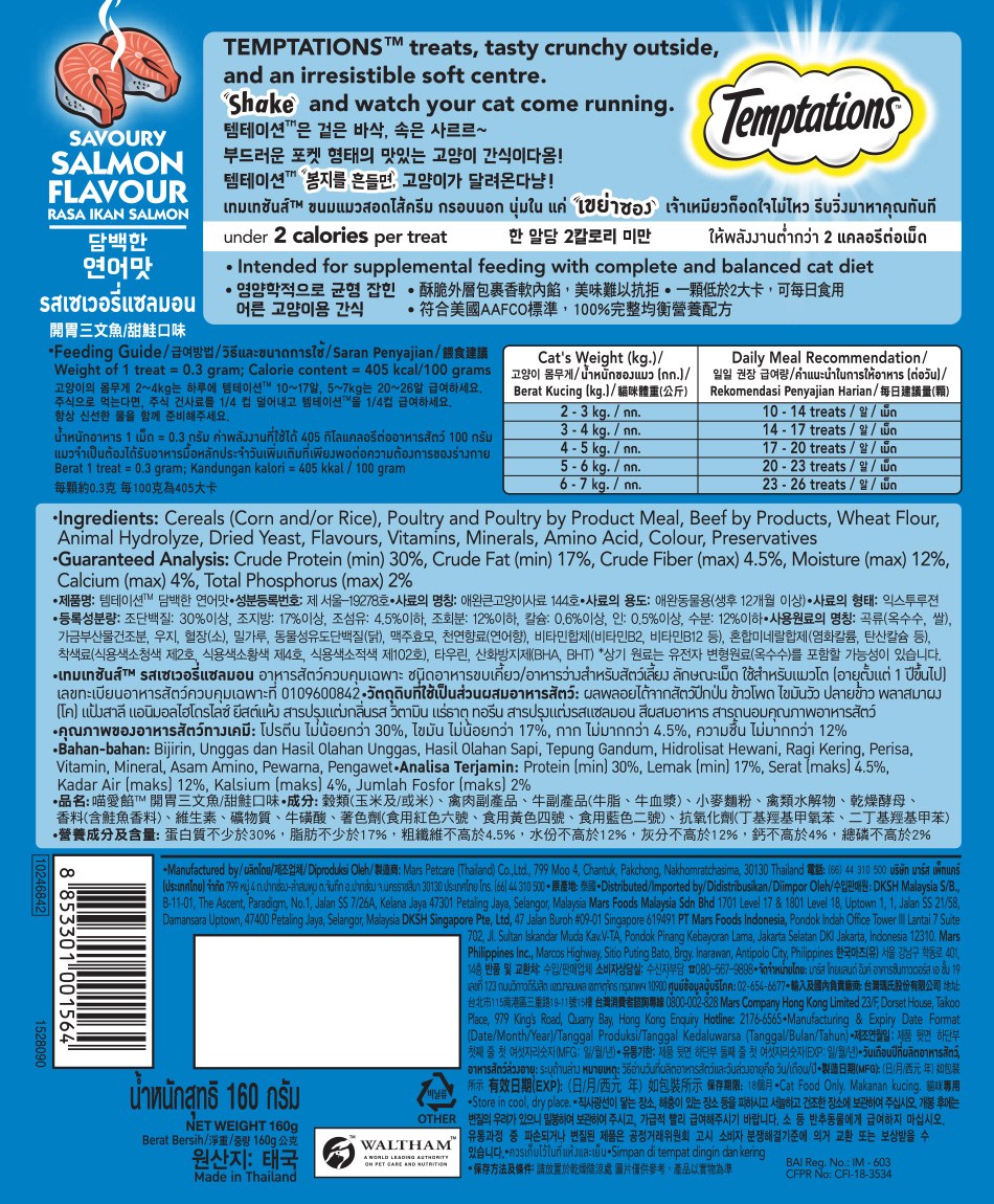 | 품명 및 모델명 | 템테이션 담백한 연어맛 | 인증/허가 사항 | 사료관리법에 따른 성분등록번호 : 컨텐츠 참조 |