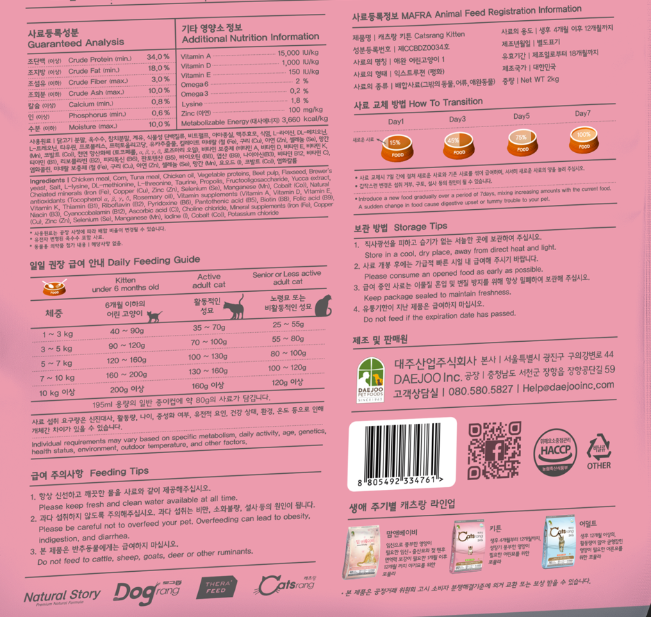 | 품명 및 모델명 | New 캐츠랑 키튼 2KG | 인증/허가 사항 | 해당없음 |