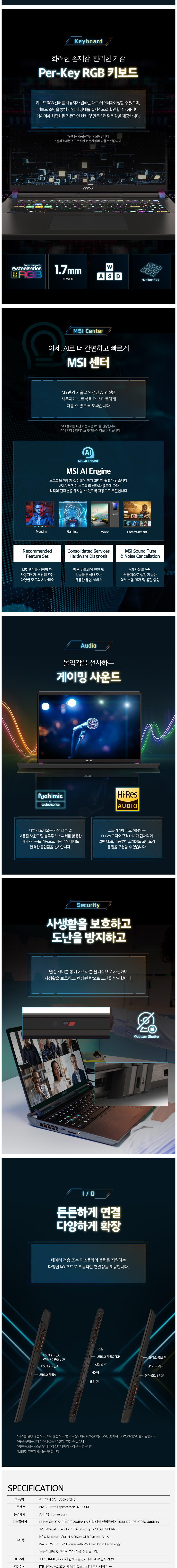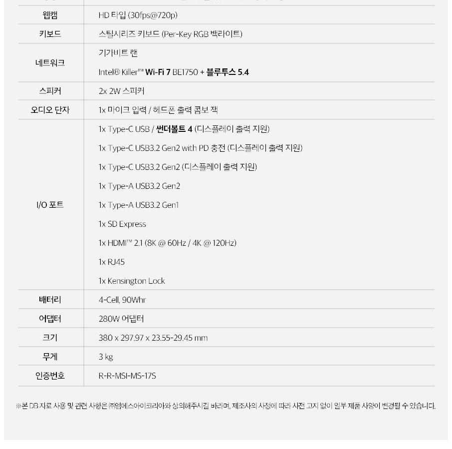 | 품명 및 모델명 | MSI 2024 벡터 17 HX 코어i9 인텔 14세대 지포스 RTX 4070 / MS-17S | KC 인증정보 | YU10342-23004, R-R-MSI-MS-17S |