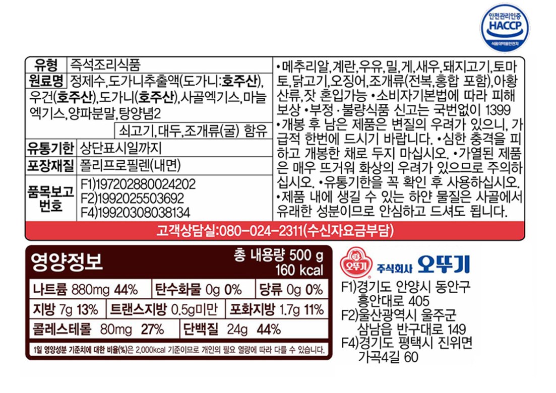 | 포장단위별 내용물의 용량(중량), 수량 | 500g, 5개 | 원재료명 및 함량 | 컨텐츠 참조 |