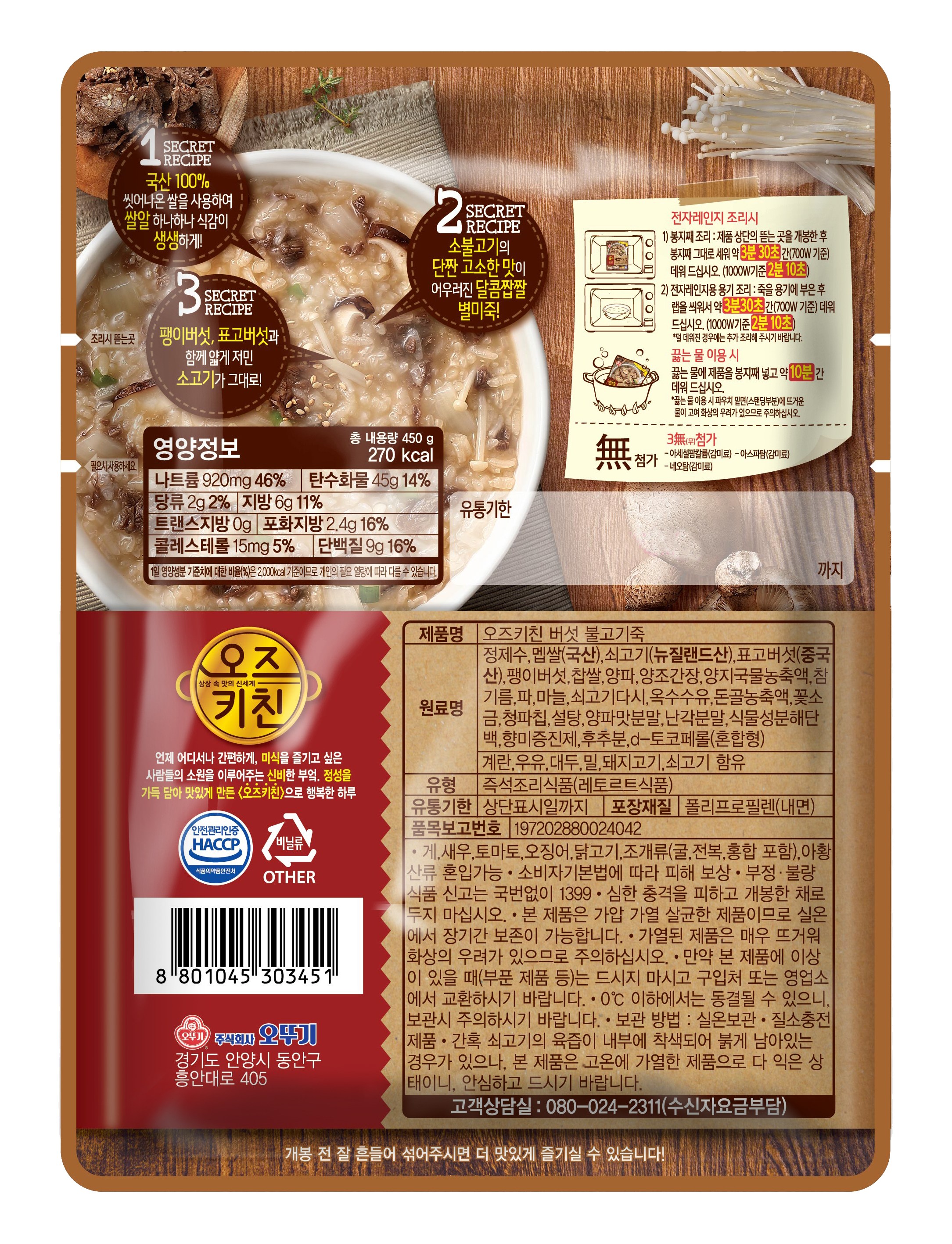 | 제품명 | 오즈키친 버섯 불고기죽 | 식품의 유형 | 컨텐츠 참조 |