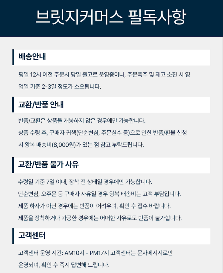 | 교환/반품 비용 (왕복비용) | 8,000원 - 단, 고객 변심의 경우에만 발생 - 도서산간 지역 배송불가 |