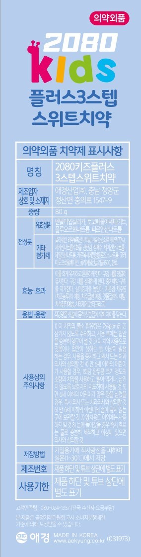 | 품명 및 모델명 | 2080키즈플러스3스텝스위트치약 | 인증/허가 사항 | 의약외품 |