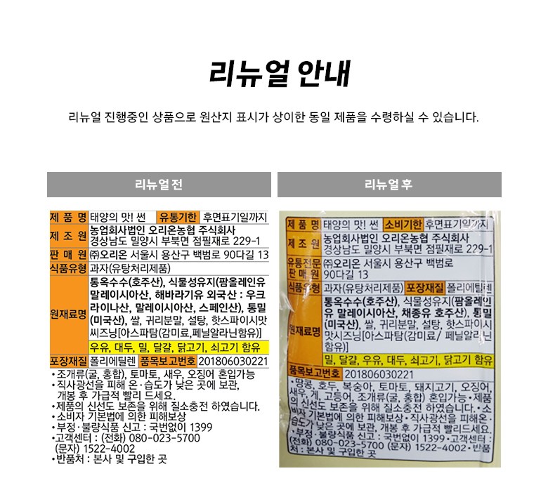 | 제품명 | 태양의 맛! 썬 | 식품의 유형 | 컨텐츠 참조 |
