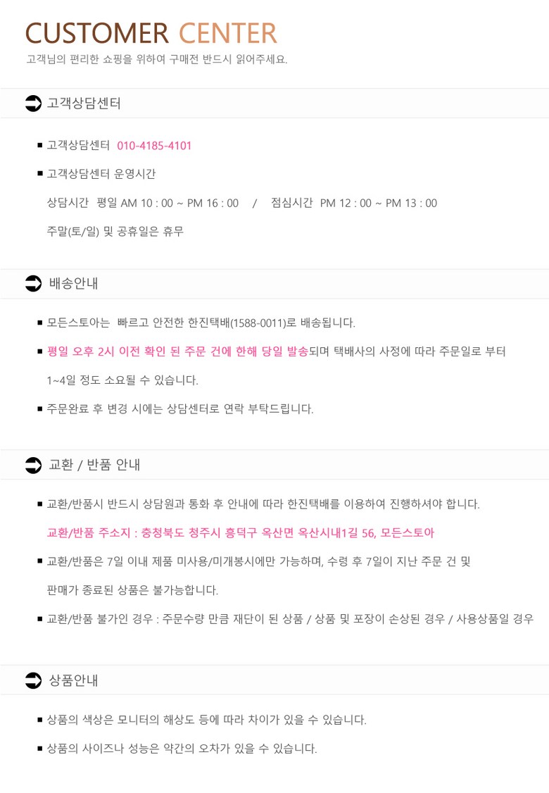 - ㆍ모니터 해상도의 차이로 인해 색상이나 이미지가 실제와 달라, 고객이 단순 변심으로 교환/반품을 무료로 요청하는 경우