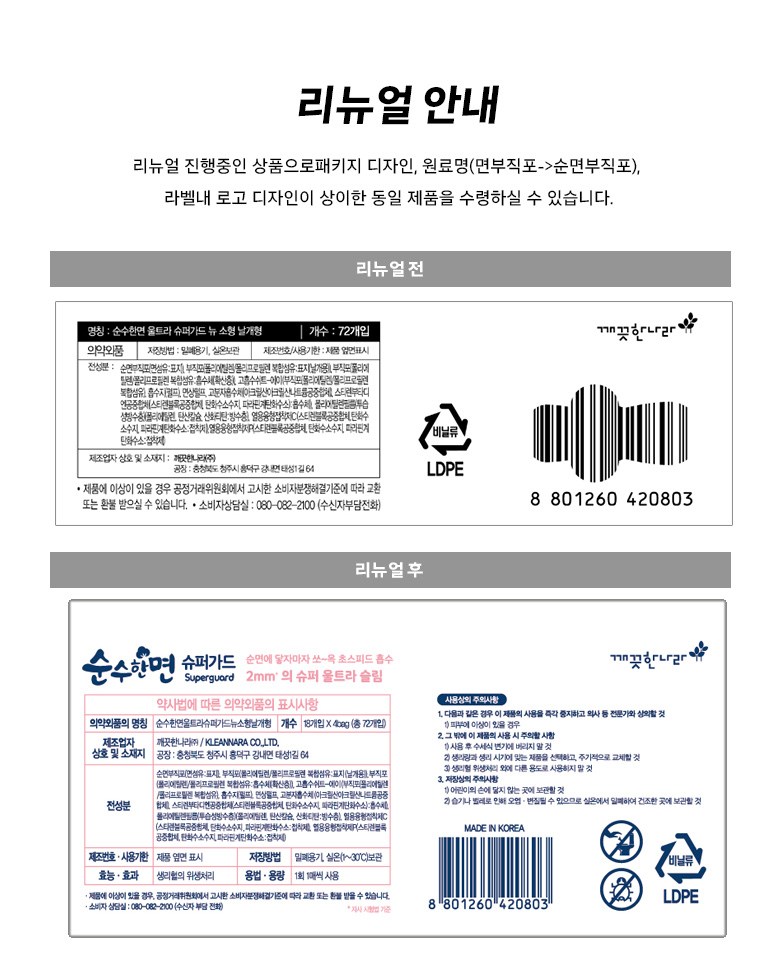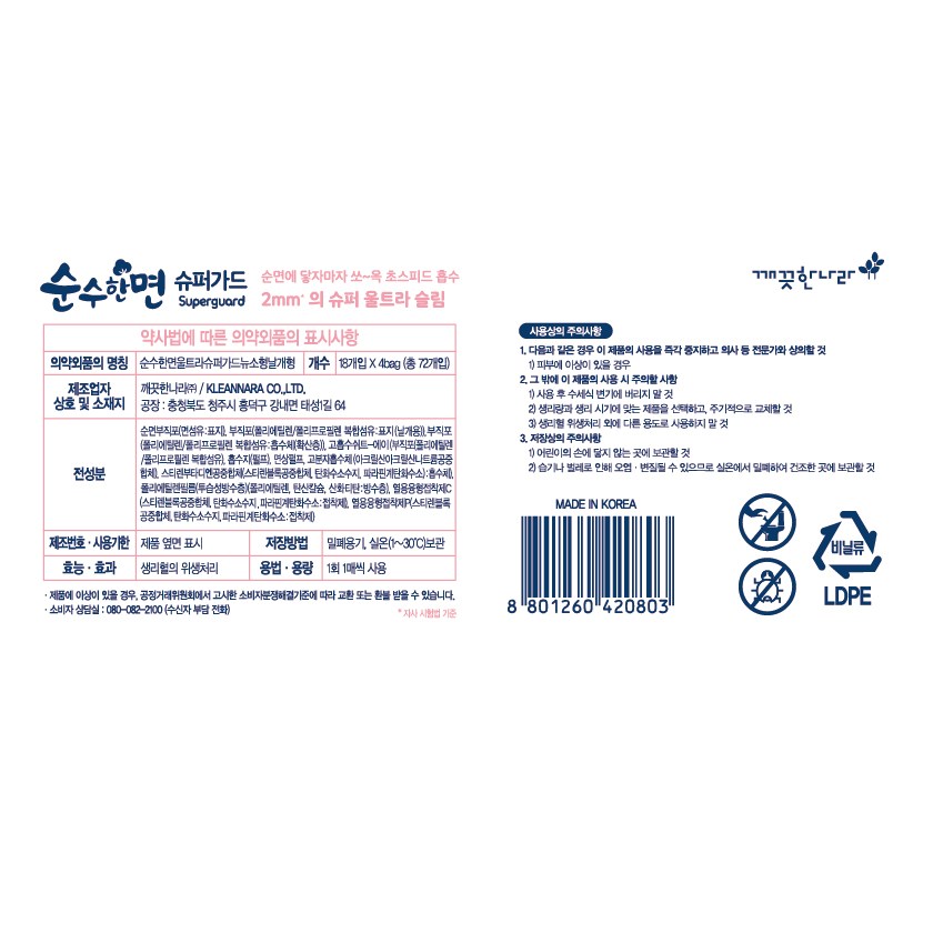 | 품명 및 모델명 | 순수한면 울트라 슈퍼가드 뉴 소형 날개형 | 인증/허가 사항 | 의약외품 |