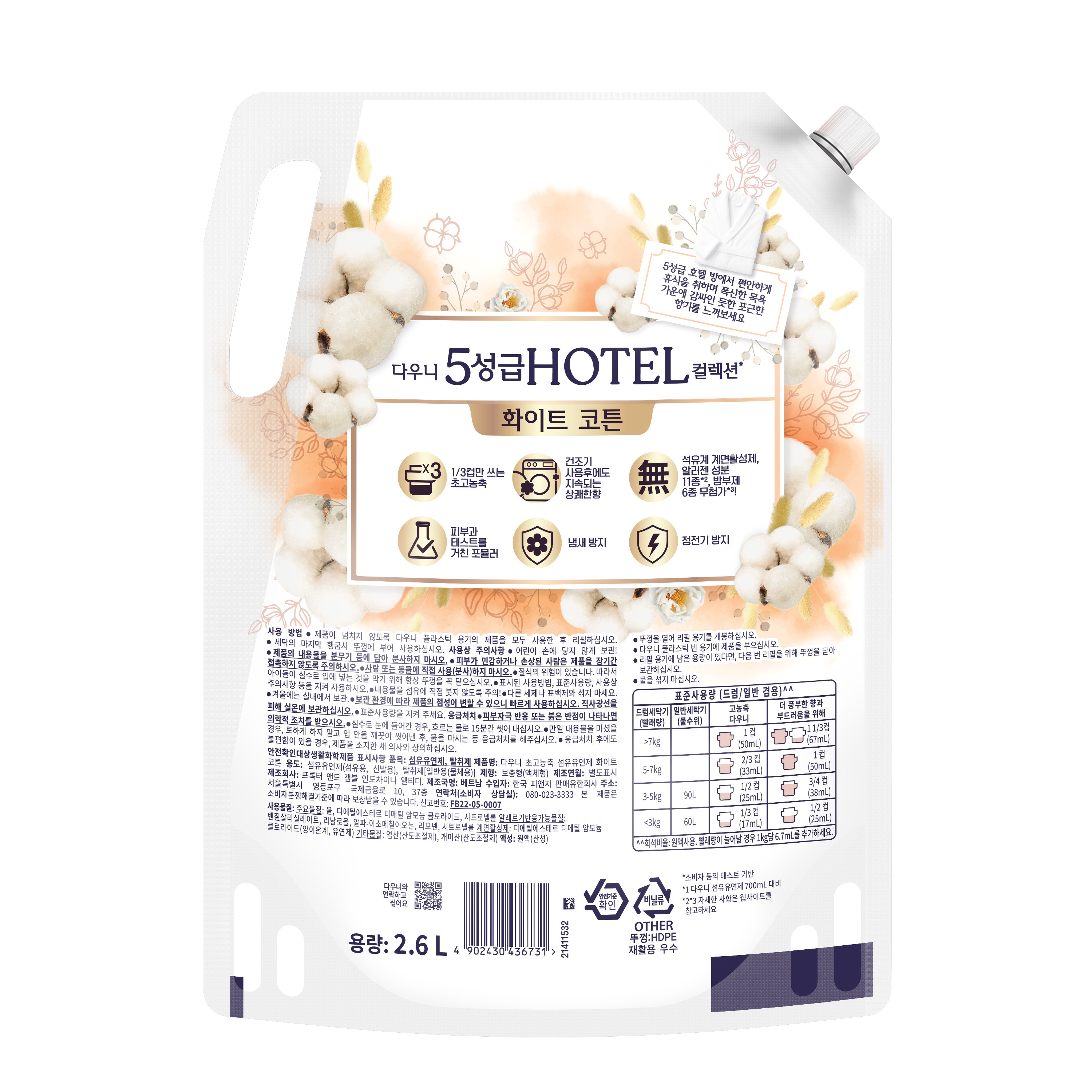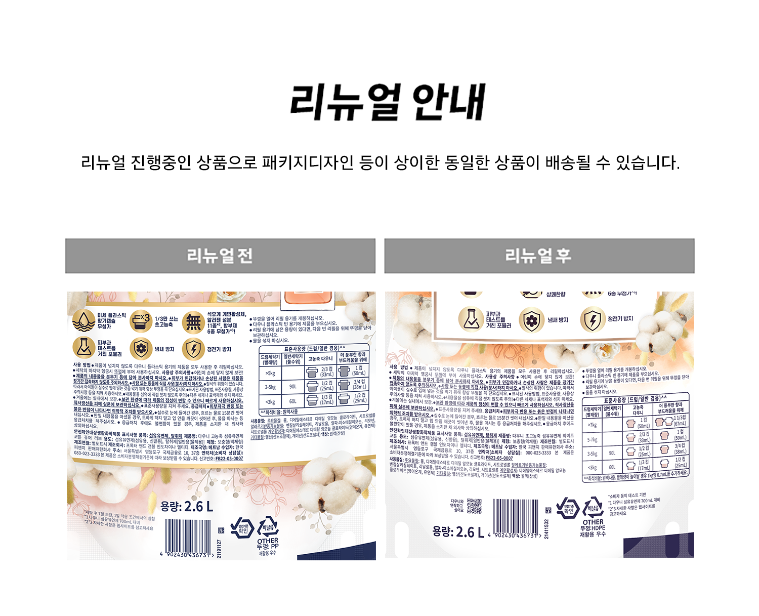 | 품목 및 제품명 | 리뉴얼전: 섬유유연제, 탈취제 / 다우니 고농축 섬유유연제 코튼 퓨어 러브 | 리뉴얼후: 섬유유연제, 탈취제 / 다우니 초고농축 섬유유연제 화이트 코튼 | 용도(표백제의 경우 계열을 함께표시) 및 제형 | 섬유유연제(섬유용, 신발용), 탈취제[(일반용(물체용)] / 보충형(액체형) |