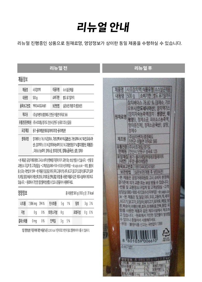 | 포장단위별 내용물의 용량(중량), 수량 | 500g *1개 | 원재료명 및 함량 | 컨텐츠 참조 |