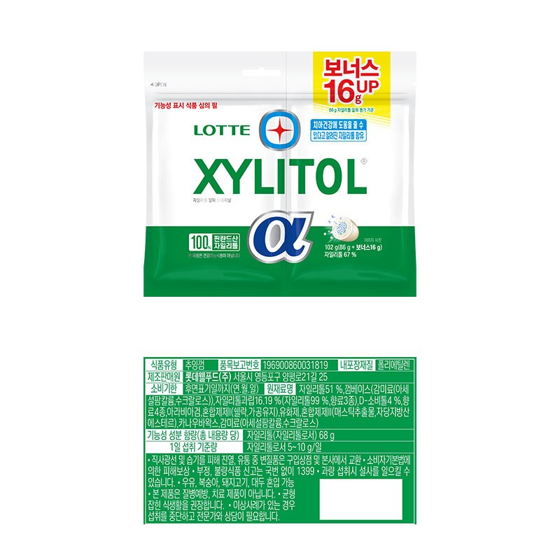 | 제품명 | LOTTE 자일리톨 알파 오리지날 | 식품의 유형 | 컨텐츠 참조 |