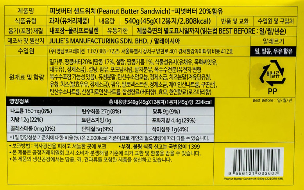 | 포장단위별 내용물의 용량(중량), 수량 | 540g x 2개,1개 | 원재료명 및 함량 | 컨텐츠 참조 |