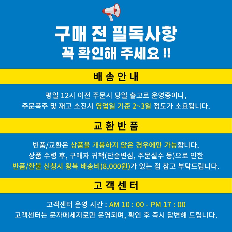 - ㆍ교환/반품에 관한 일반적인 사항은 판매자가 제시사항보다 관계법령이 우선합니다.