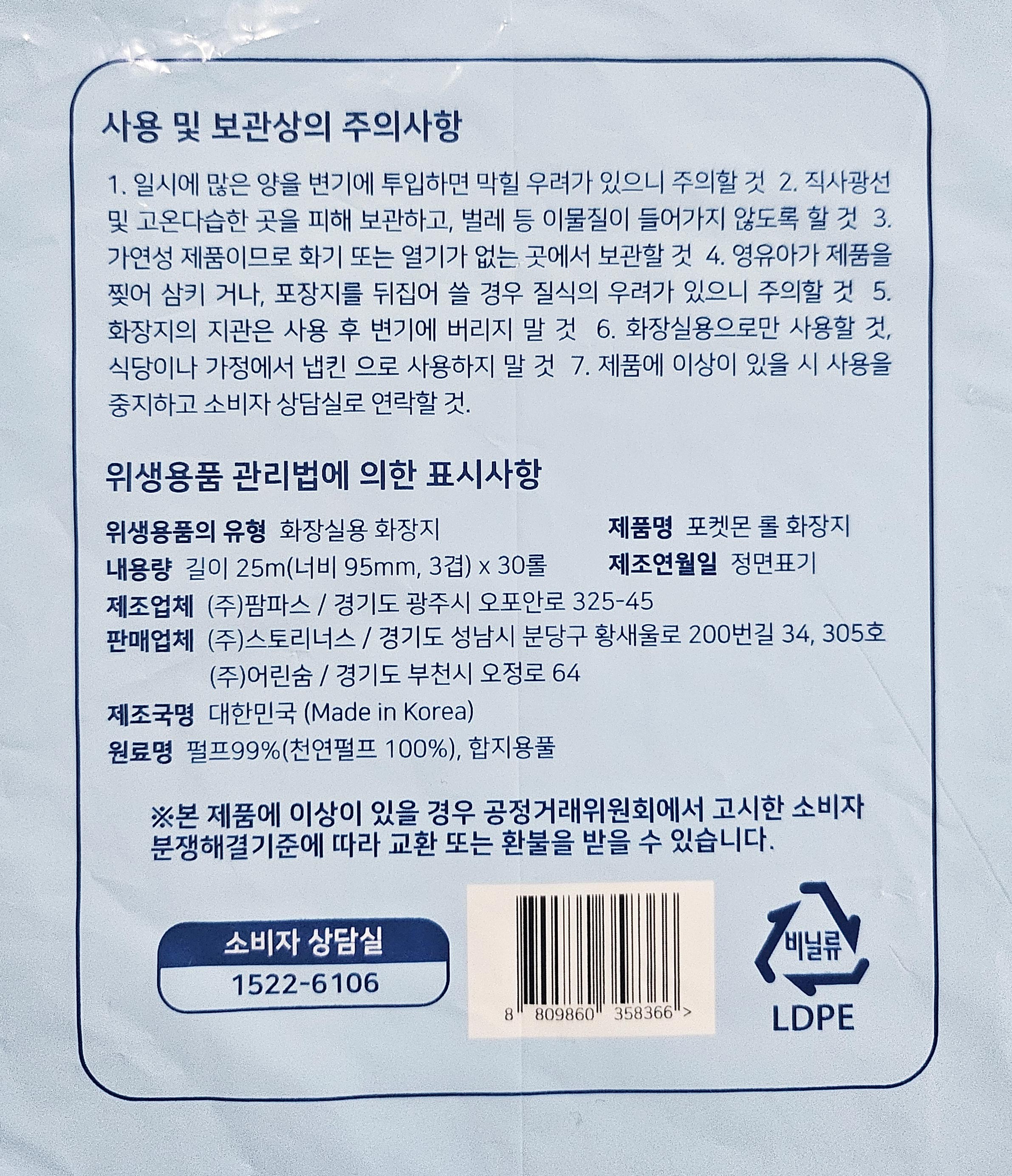 | 품명 및 모델명 | 포켓몬 롤 화장지 | 인증/허가 사항 | 위생용품 |